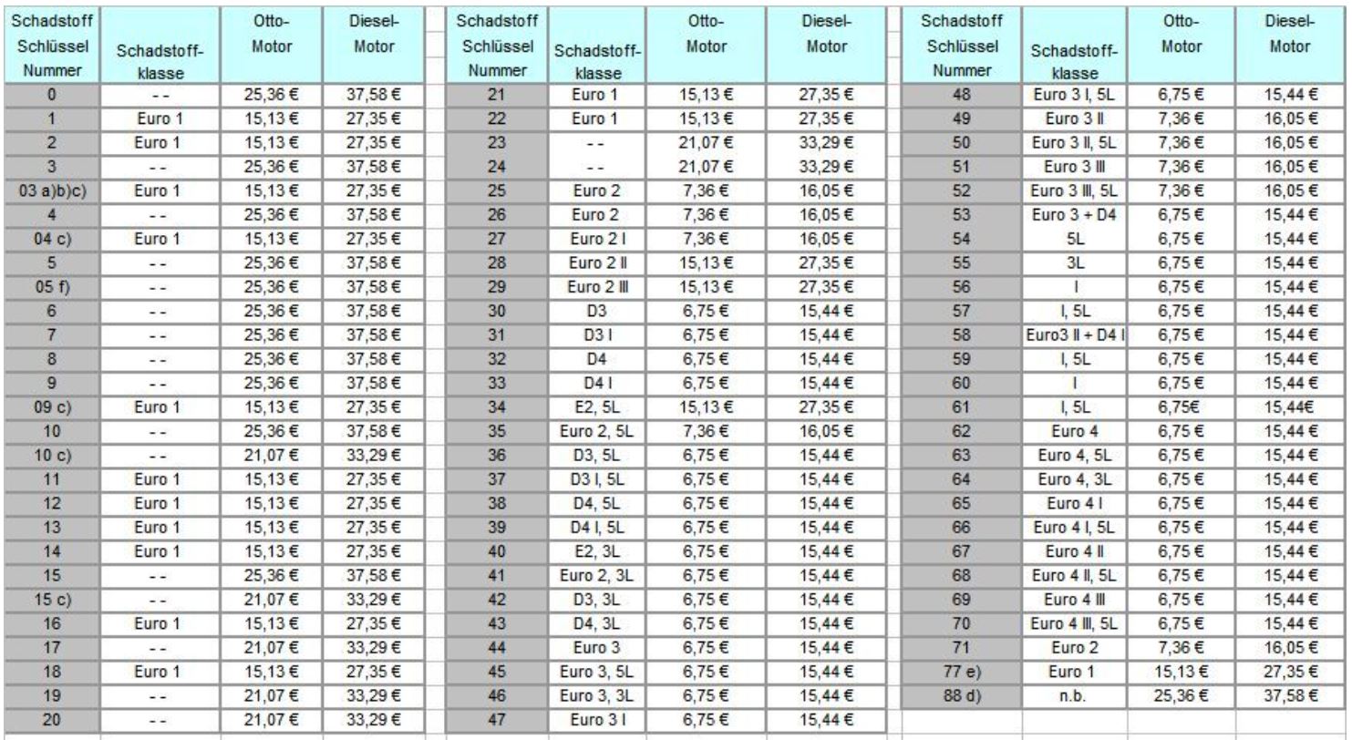 Hier die Gegenüberstellungen der einzelnen Schadstoffschlüsselnummern und der dazugehörigen Steuersätze.
