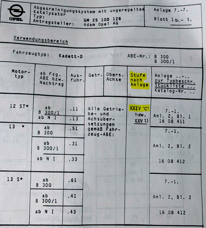 Auch mein ehemaliger Kadett D mit 13S Motor und nachgerüstetem U-Kat fiel unter die KFZ-Steuer mindernde Bezeichnung "bedingt schadstoffarm Stufe C" und hatte bis zum Jahr 2000 einen Steuersatz von 13,20 DM je 100 ccm; heute wäre dieser U-Kat null & nichtig und würde bei einer regulären Zulassung Kosten von 25,36 EUR je angefangene 100 ccm verursachen; da nur noch die G-Kat Fahrzeuge den niedrigeren Steuersatz bekommen.