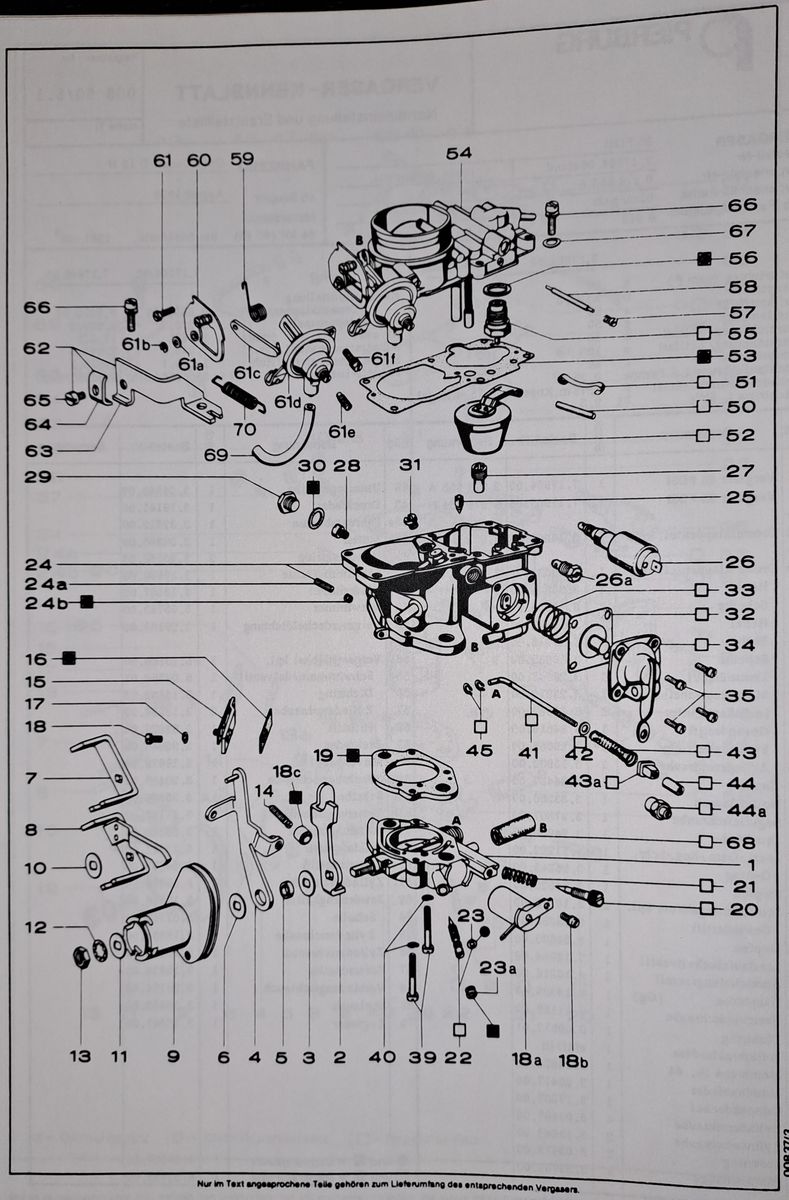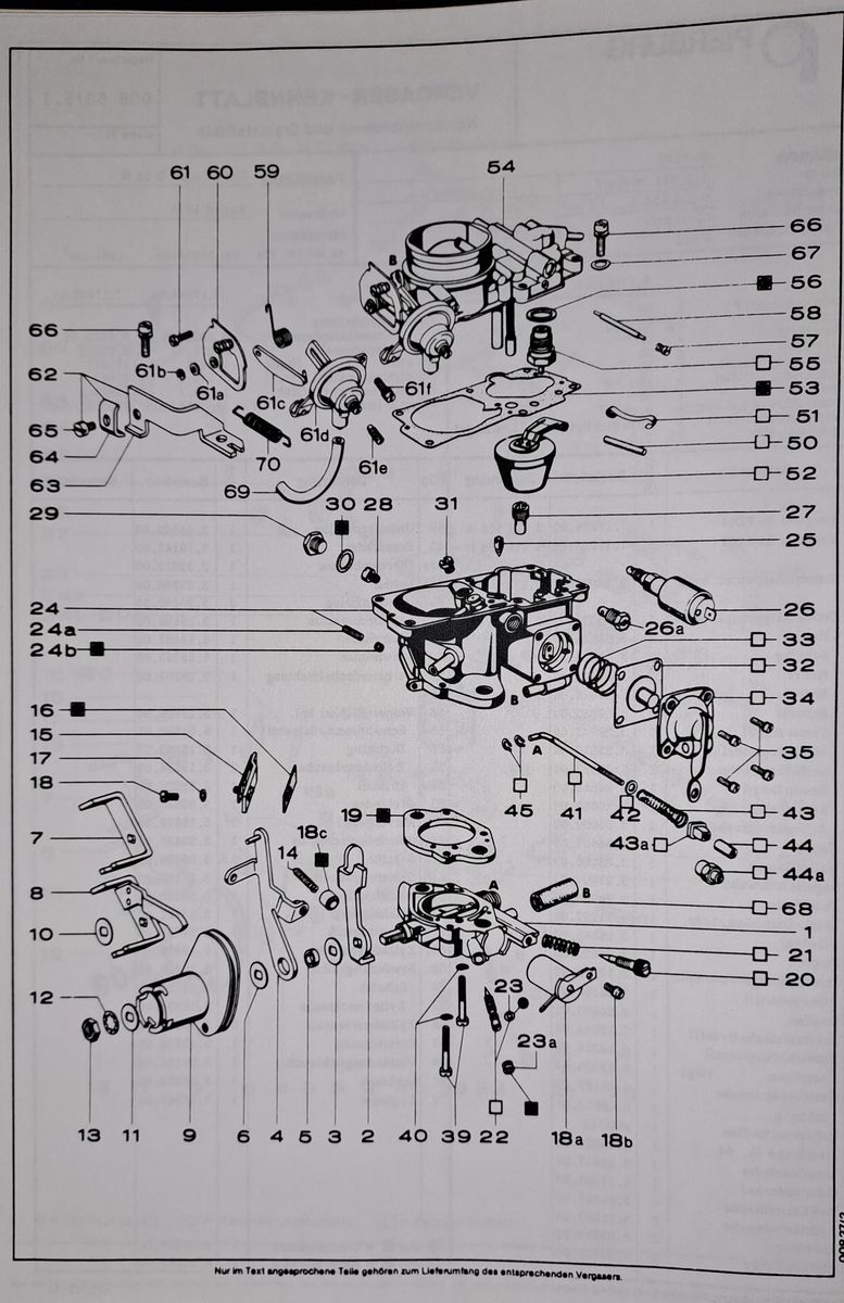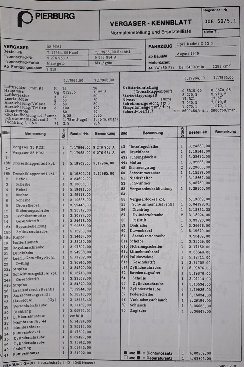 Habe die Herstellerunterlagen von Pierburg zu Hause liegen, kann ich Dir heute Abend heraussuchen und zukommen lassen. Um Deinen Vergaser genau eingrenzen zu können, benötige ich die Fahrgestellnummer oder zumindest das Produktionsdatum Deines Kadetten; mindestens Monat und Jahr.