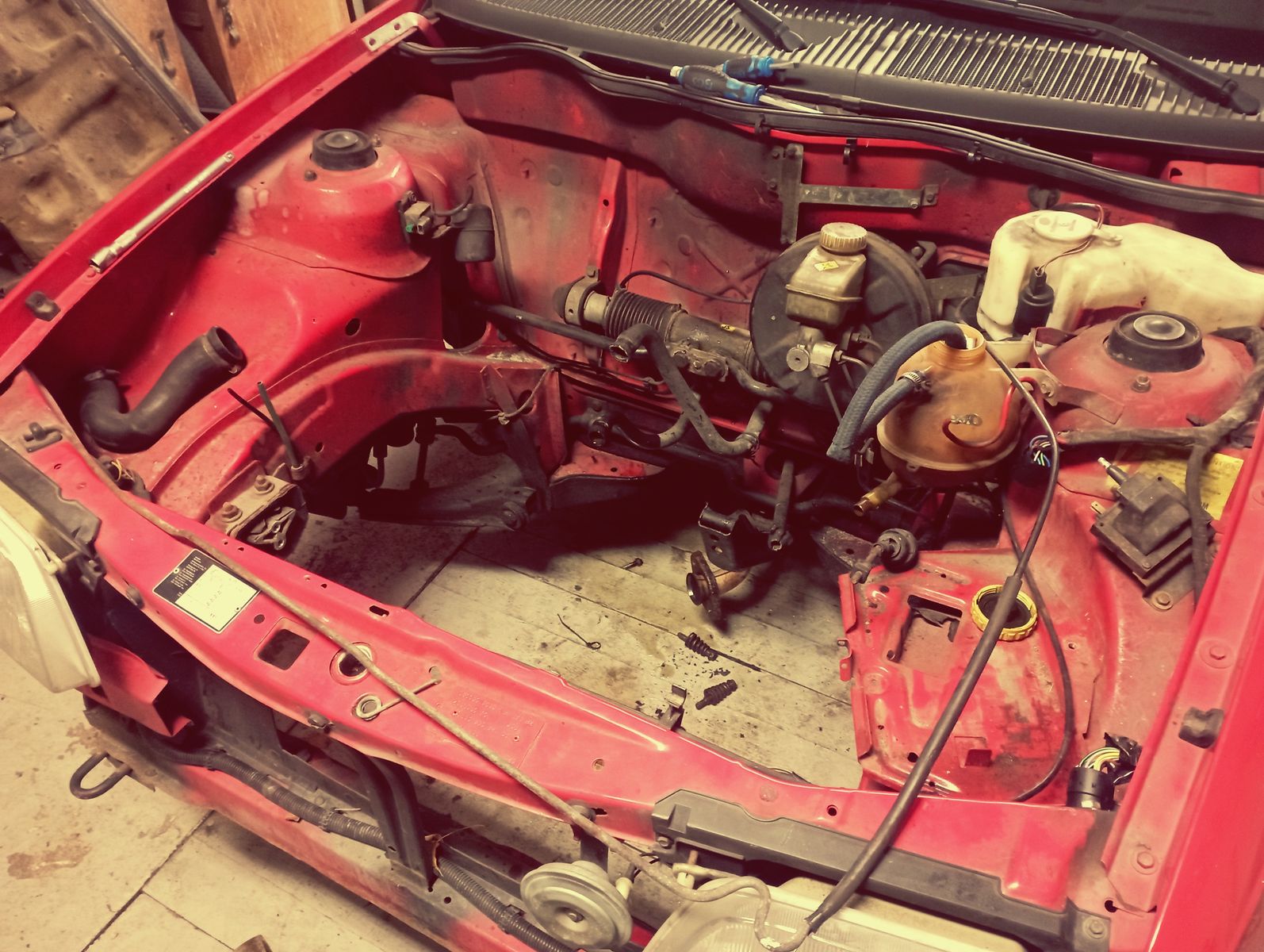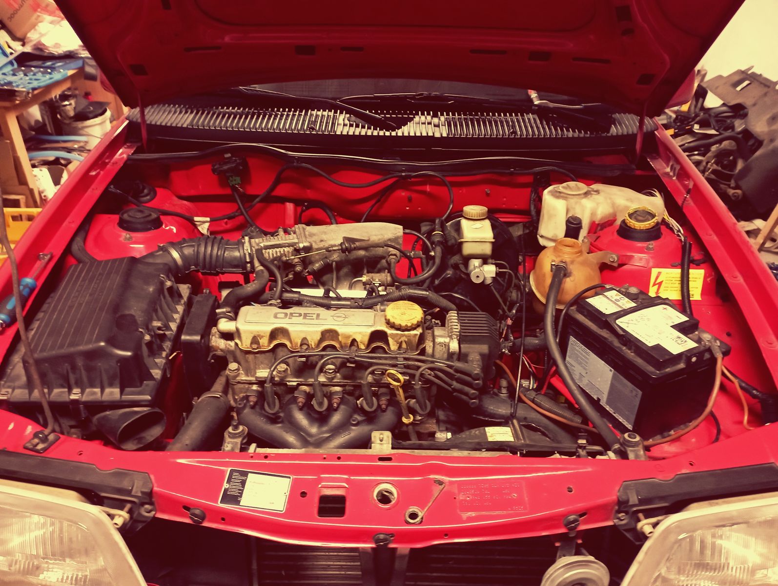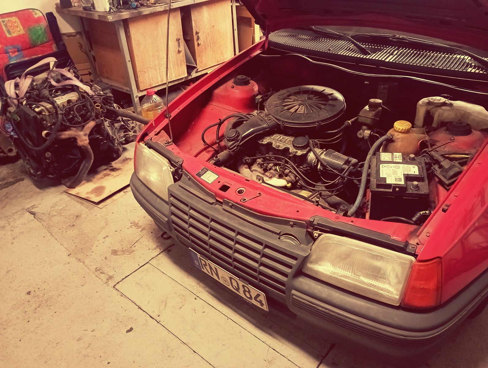 Wo ist jetzt die die Änderung? Kurz bevor ich mich dazu entschlossen habe endlich mein Technikpaket auszubauen kam ein Freund zu mir und meiner er könnte eine Astra F Stufe kaufen. Automatik und 1,6er mit 100PS den er schlachten würde. Haube geöffnet, hing da ein C16SE drin. Ich habe gefragt was er haben möchte, wenn ich Motor mit Kabelbaum und Bremsanlage selbst ausbaue. 100€, also sofort eingewilligt. Eine Woche später habe ich dann fix den Astra geschlachtet.
