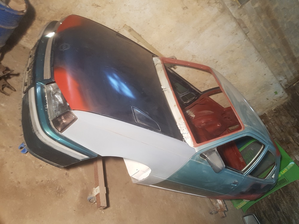 2. Eine Kadett E 1.4 Rohkarosse (1990) so gut wie rostfrei. Abgemeldet seit 2000. Unterboden und Innenraum sandgestrahlt , lackiert und konserviert. Radläufe hinten gezogen.