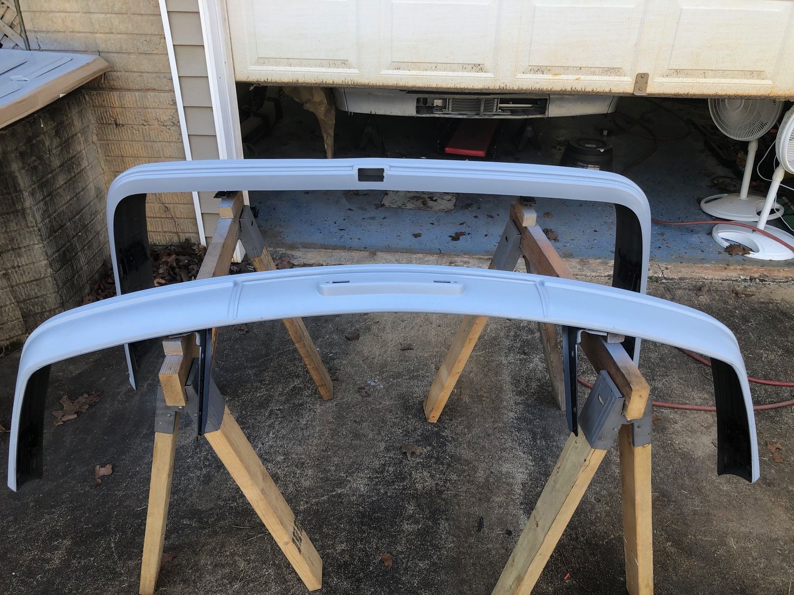 Hier noch Fotos von den lackierten Stoßstangen. Da diese dünn mit der Schaumstoffrolle lackiert wurden, blieb die Struktur erhalten.