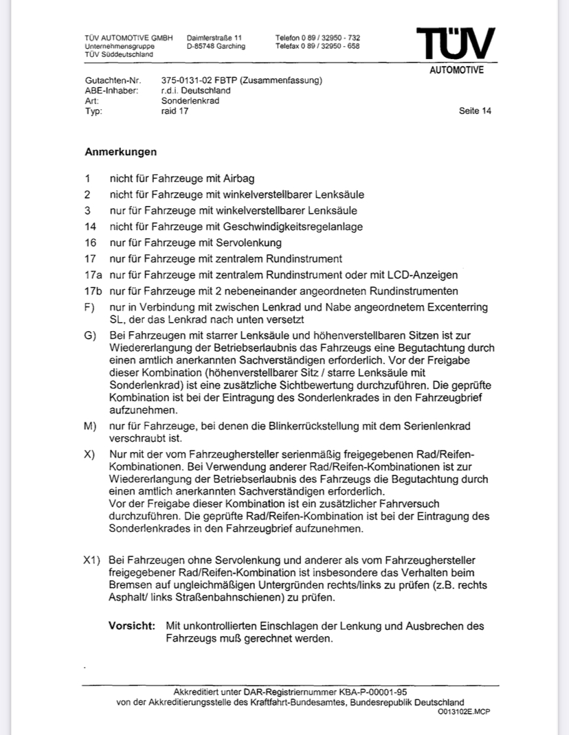Ich hatte eine Zeit lang ein Orginal 30er RAID Lenkrad im Kadett verbaut allerdings ist dieses laut ABE Bestimmungen nicht in meinem Auto zulässig (kein Zentrales oder Digitales Tacho oder eine höhenverstellbare Lenksäule) . Ich habe jetzt erst einmal wieder zwecks streßvermeidung mit der Rennleitung das Originale drin.