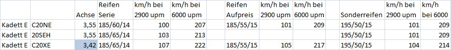 Kadett Champion, Vectra (mit Aufpreis Reifen), Calibra und Astra F sind annährend gleich übersetzt. (bei 6000upm 217 und 218Km/h)