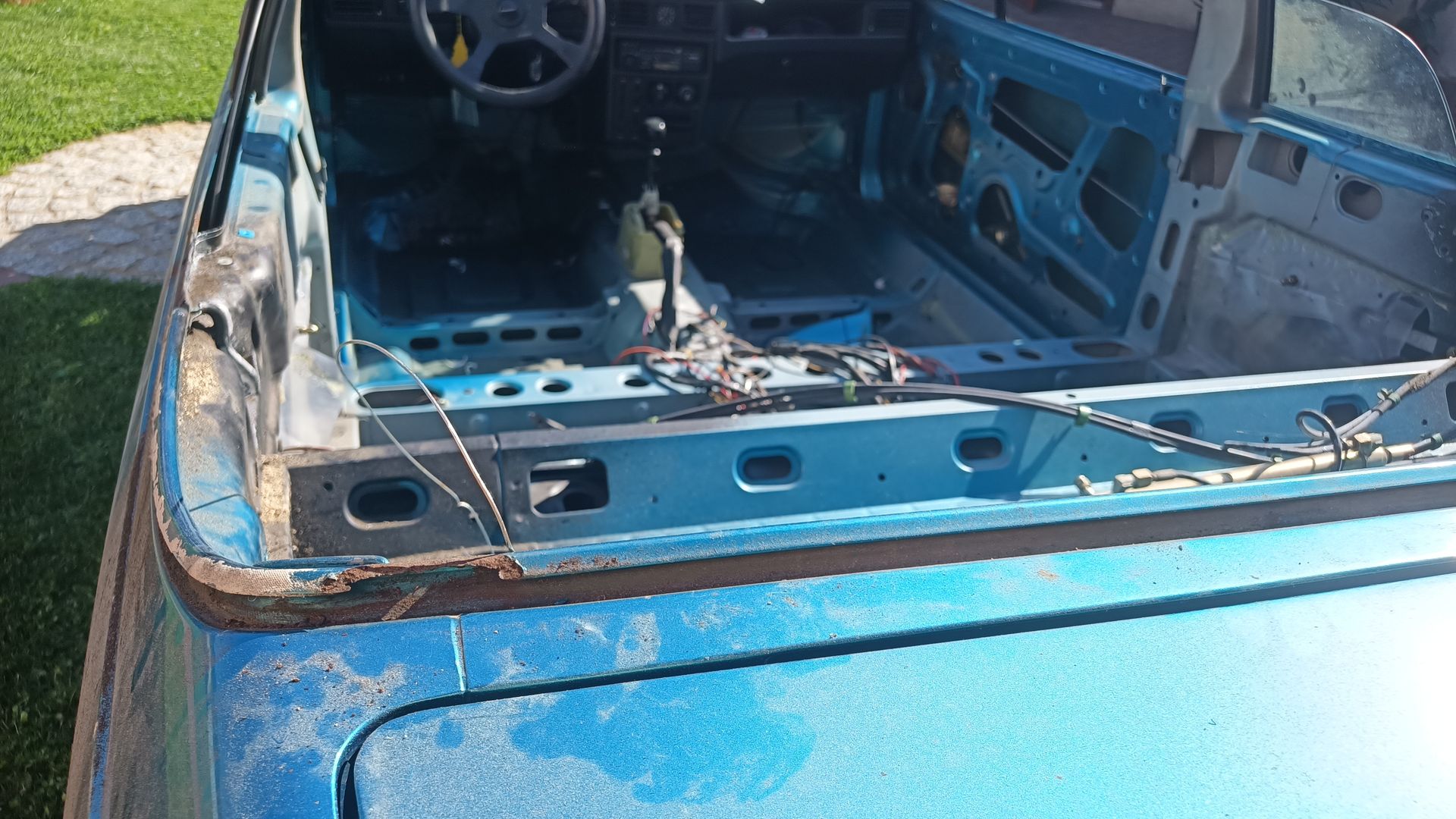 Der TÜV hat die braune Pest bemängelt, was dazu führte, dass ich die Schwellenverkleidung links abgemacht habe um nachzuschauen. Und die rechte, die Stoßstangen... Ach was soll's, einmal komplett bitte!