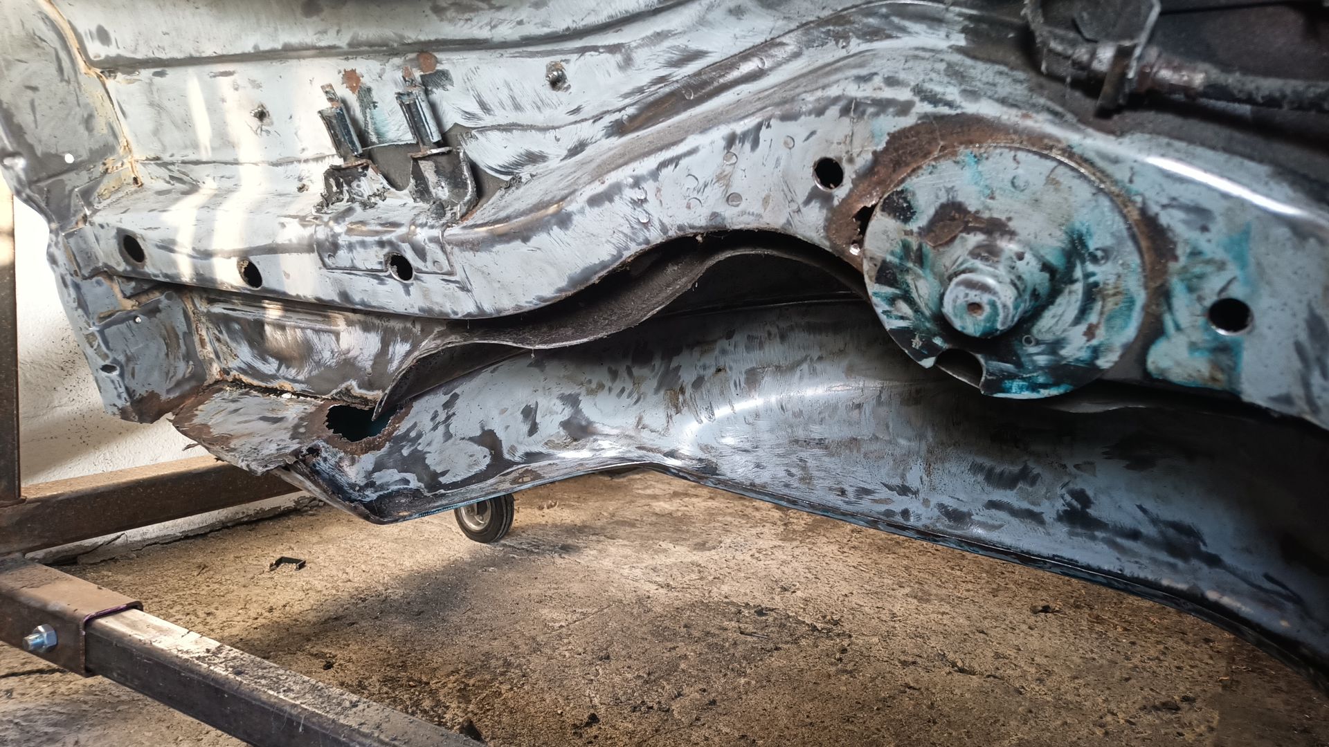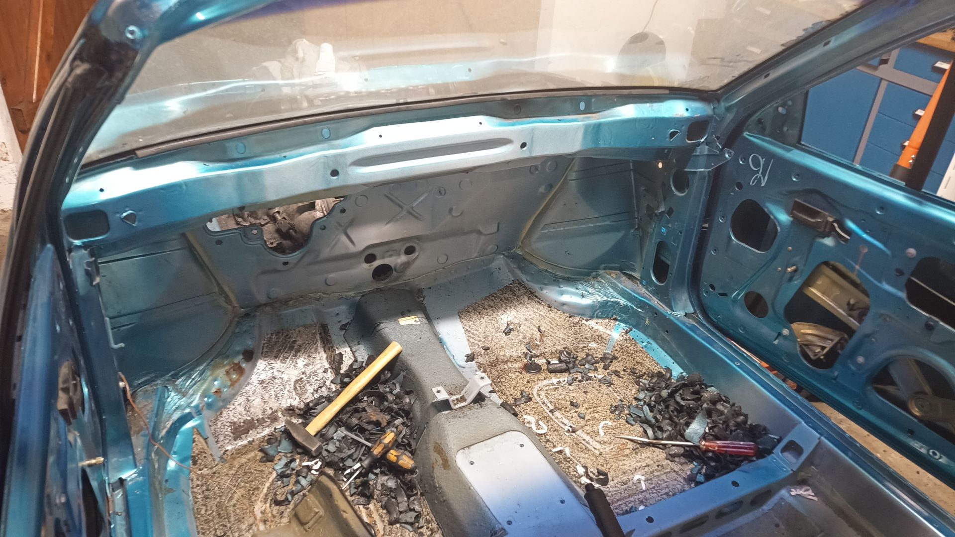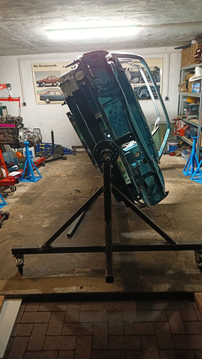 Motor und Achsen kommen noch raus, dann Trockeneisstrahlen, dann Karosseriebauer und Lackierer.