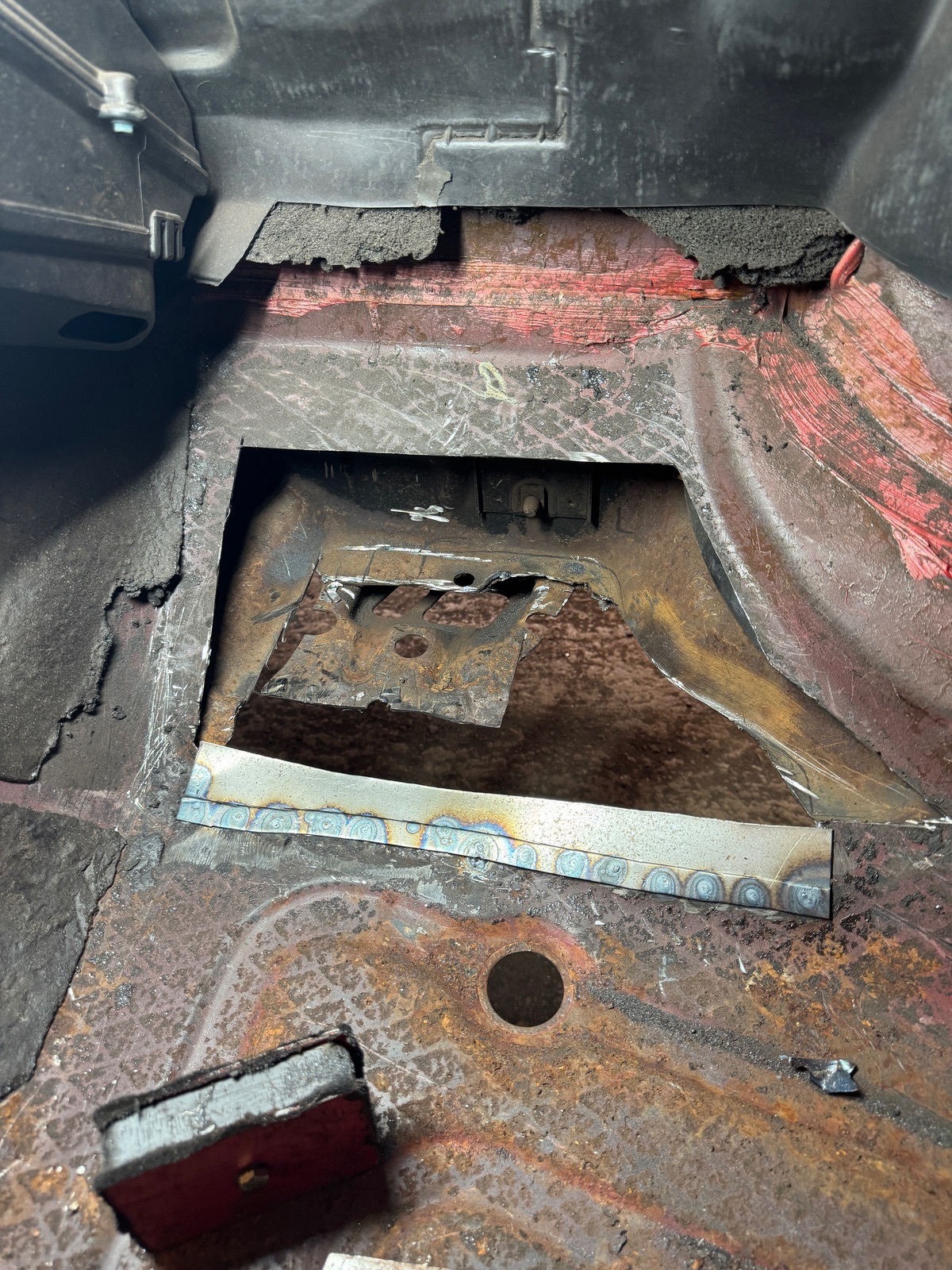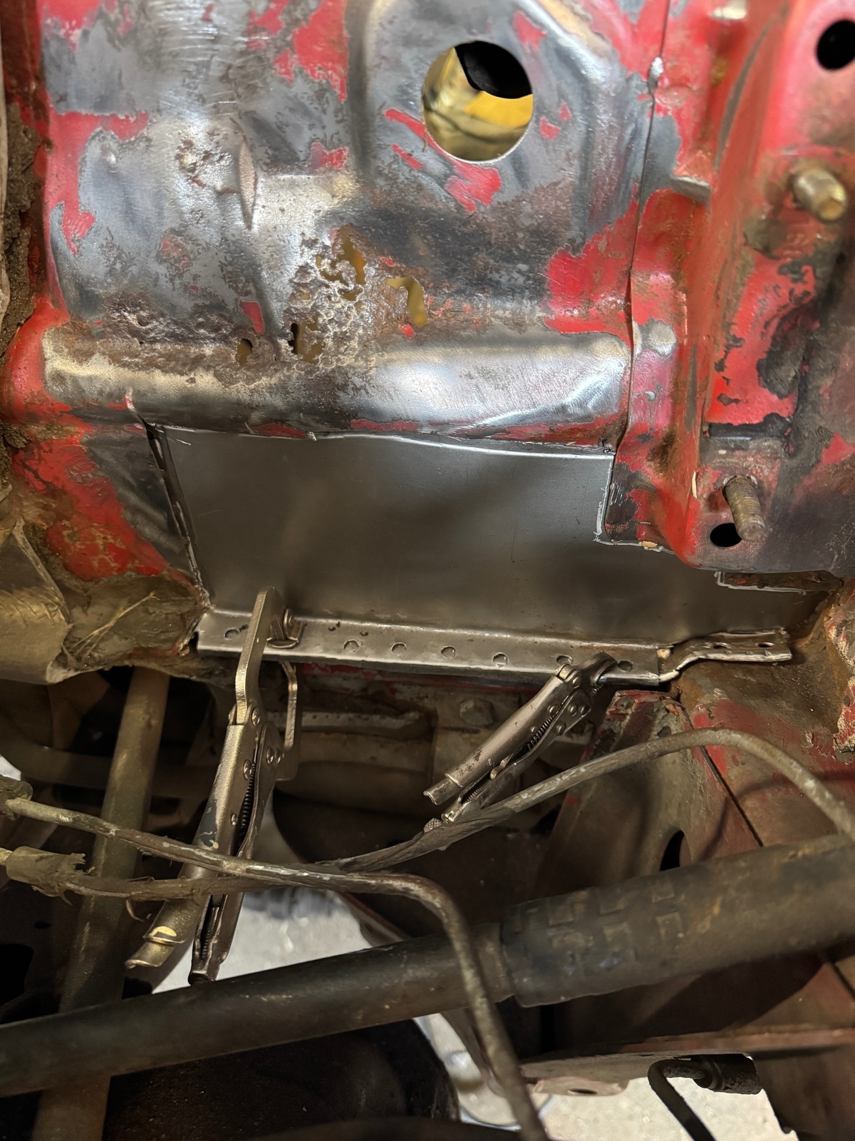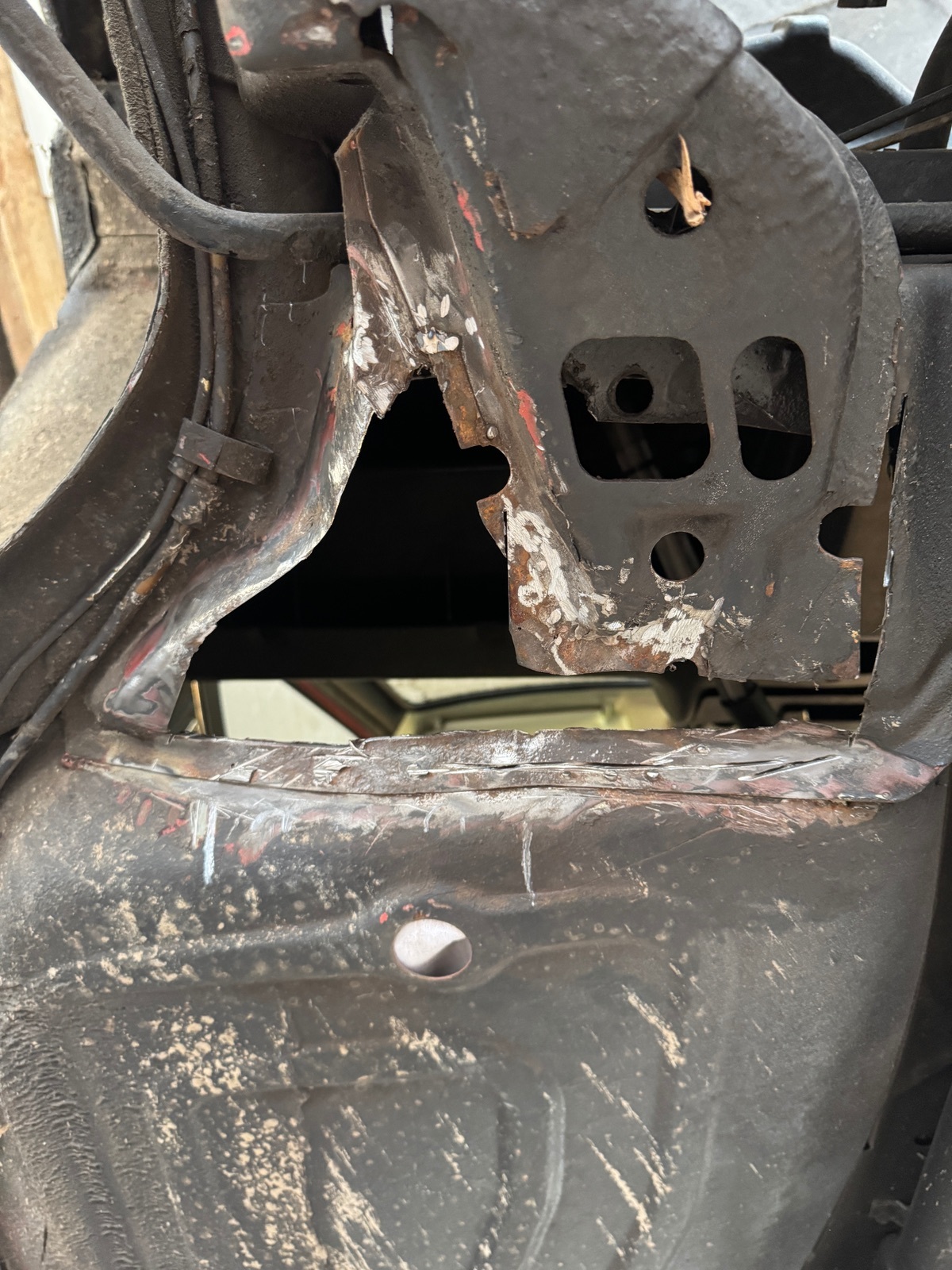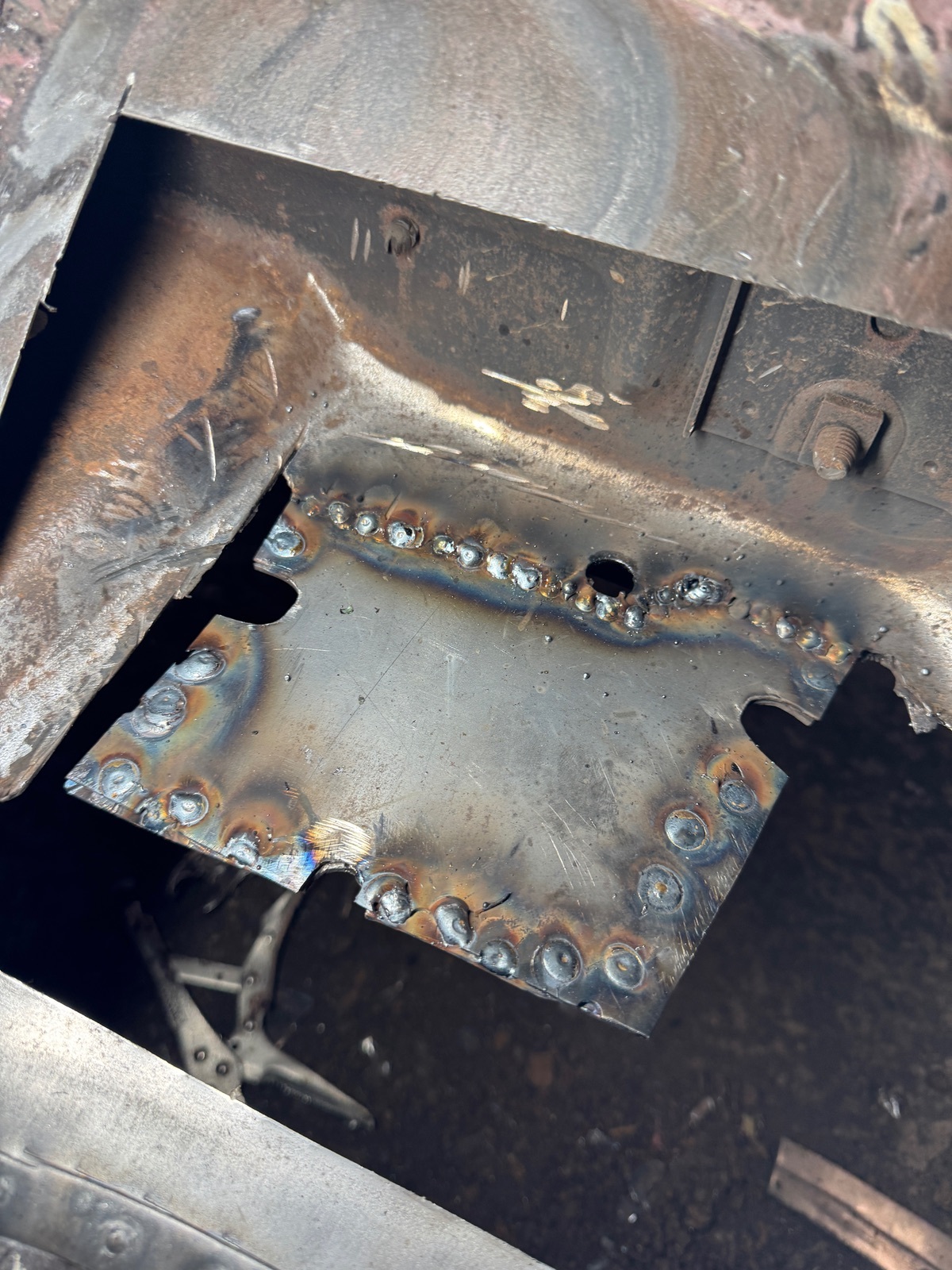 Beim rausrennen war nichts mehr zu erkennen, komplett alles Blätterteig. So wie ich die Konstruktion verstanden habe, müsste jetzt eigentlich das jetzt neue Blech, noch mit Sicken versehen werden. Mir erscheint das Ganze aber etwas unterdimensioniert und ich würde am liebsten noch ein 1,5 mm dickes Blech aufschweißen und ringsum an das alte, gesunde Blech punkten.