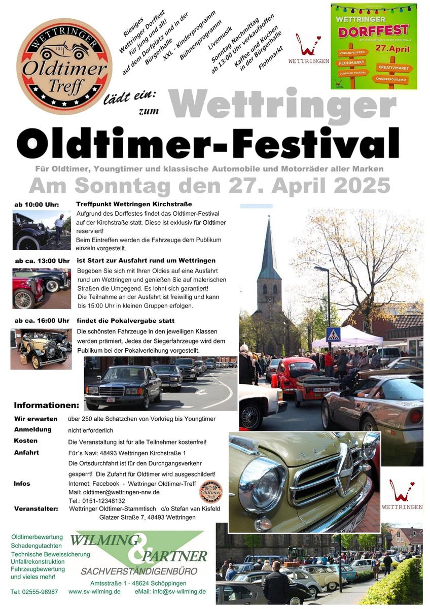 Am Sonntag, 27. April 2025 ab 10:00 Uhr ist es wieder soweit! Im Rahmen des „Wettringer Dorffestes“ findet das große „Oldtimer-Festival“ statt. Der gesamte Ortskern wird zum Oldtimer-Mekka mit allem was dazu gehört! Die durch den Ort führende Hauptstraße ist exklusiv für unsere Old- und Youngtimer reserviert! Für den „normalen“ Verkehr wird der gesamte Ortskern gesperrt und wir erwarten mehr als 500 Old- und Youngtimer aller Art!