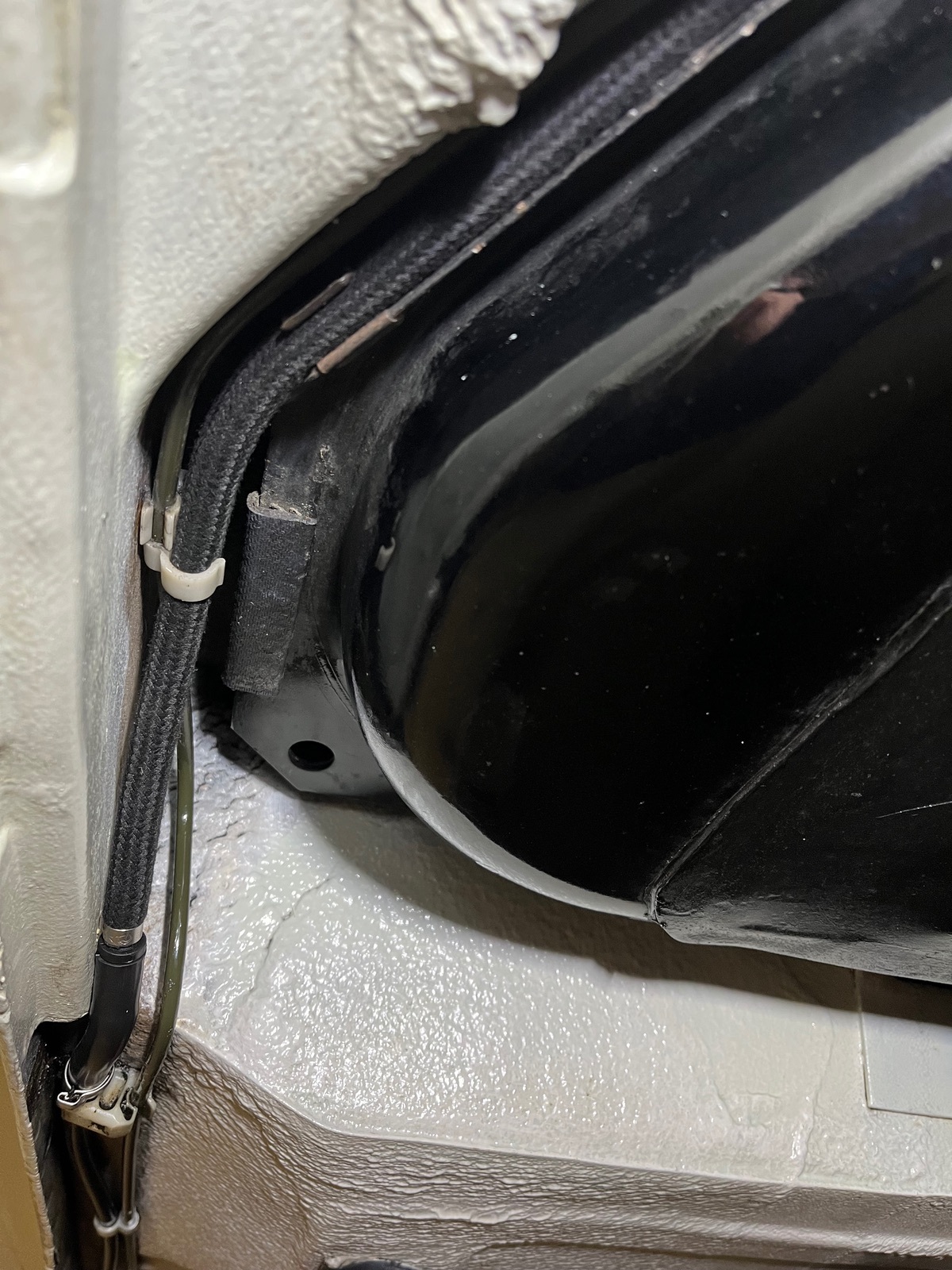 Dieser verläuft am Einfüllrohr in Richtung Tank, wird an der Mittelnaht vom Tank weiter geführt zum linken Schweller und wird dort auf einen festen Kunststoffschlauch geschoben.