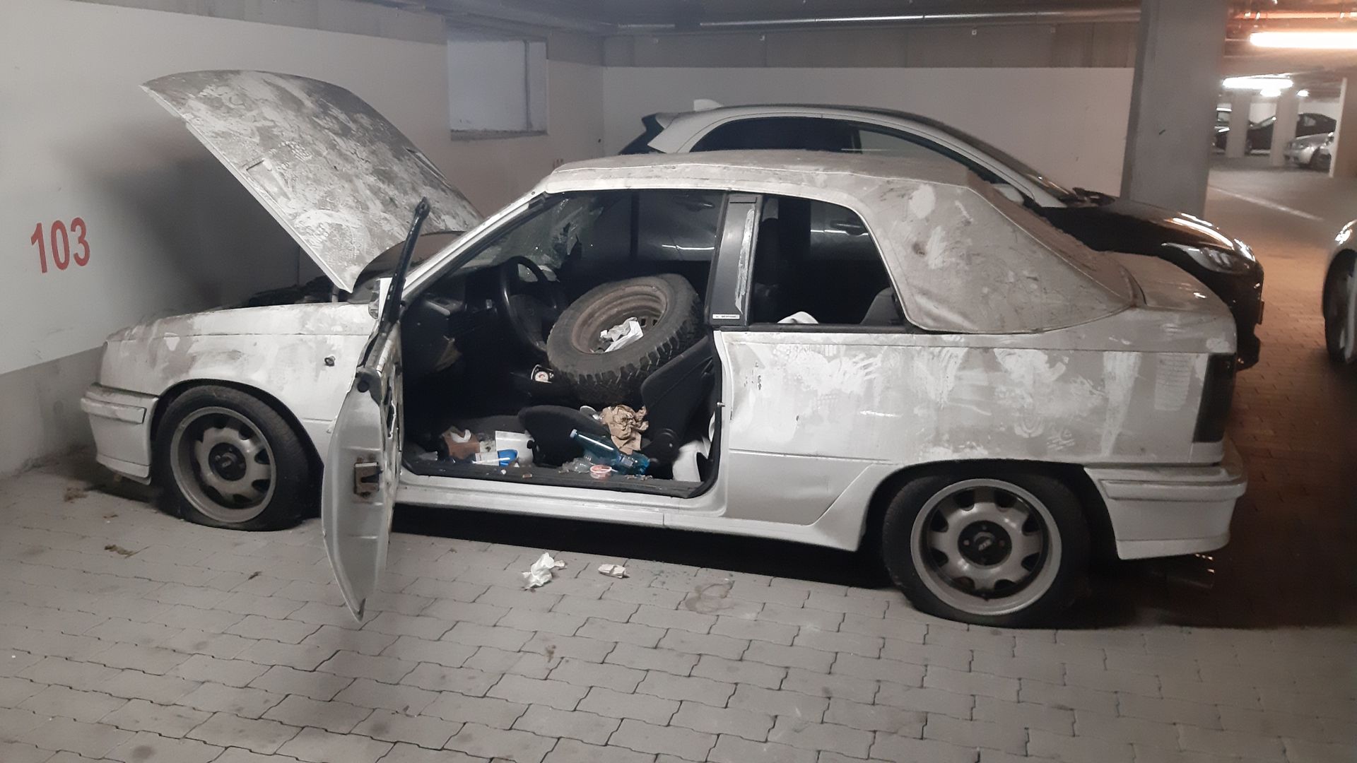 schlachte GSi Cabrio der leider Vandalen zum Opfer gefallen ist. Casablancaweiss, Chicago, ABS, eFh, ZV, elektrisches Verdeck weiss, Persenning weiss, GSi Spoiler und Haube, ATS Cup 7x15...