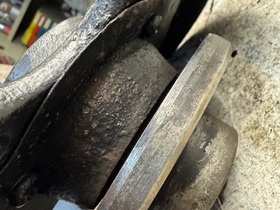 Die Auflagefläche auf der Presse, ist zumindest auf einer Seite zu klein, so dass ich da nicht stabil auflegen kann. Auf der Seite, wo der Bremssattel fest geschraubt wird, reicht es aus, auf der anderen Seite sind es vielleicht 1,5 cm.
