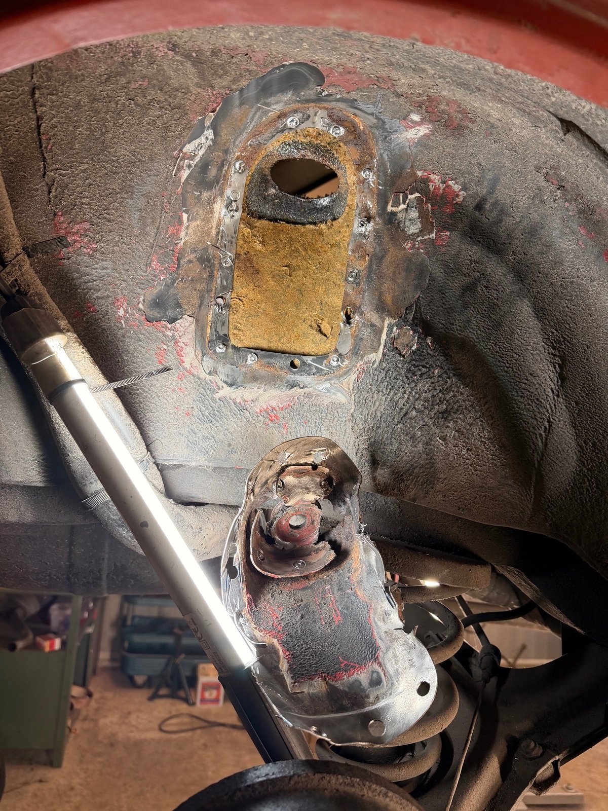 Ich hatte die Punkte komplett durch gebohrt gehabt, das alte Teil fliegt eh auf den Müll. Dann hast du Löcher im Radkasten wo du das andere Blech verschweißen kannst.