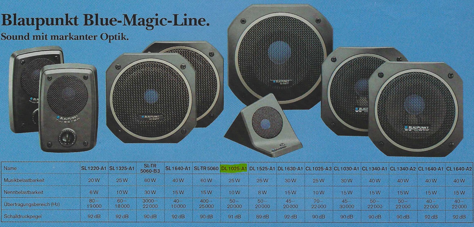 suche nach Blaupunkt Lautsprechern, die von Dir gezeigten und von Opel vertriebenen Lautsprecher wurden damals von Blaupunkt für Opel gefertigt. Diese Bauform war die DL-xxxx Serie von Blaupunkt, wobei die ersten beiden Ziffern den Durchmesser des Lautsprechers definierten, z.B. DL-10xx. Diese gab es ab 10 cm Durchmesser in 3 oder 4 verschiedenen Größen und mit zwei unterschiedlichen Gitterformen, der Rahmen war aber immer in dieser markanten Form, gab es in unterschiedlichen Farben und auch mit farblich abgesetzten Ring um das Gitter; so wie bei mir zu sehen.