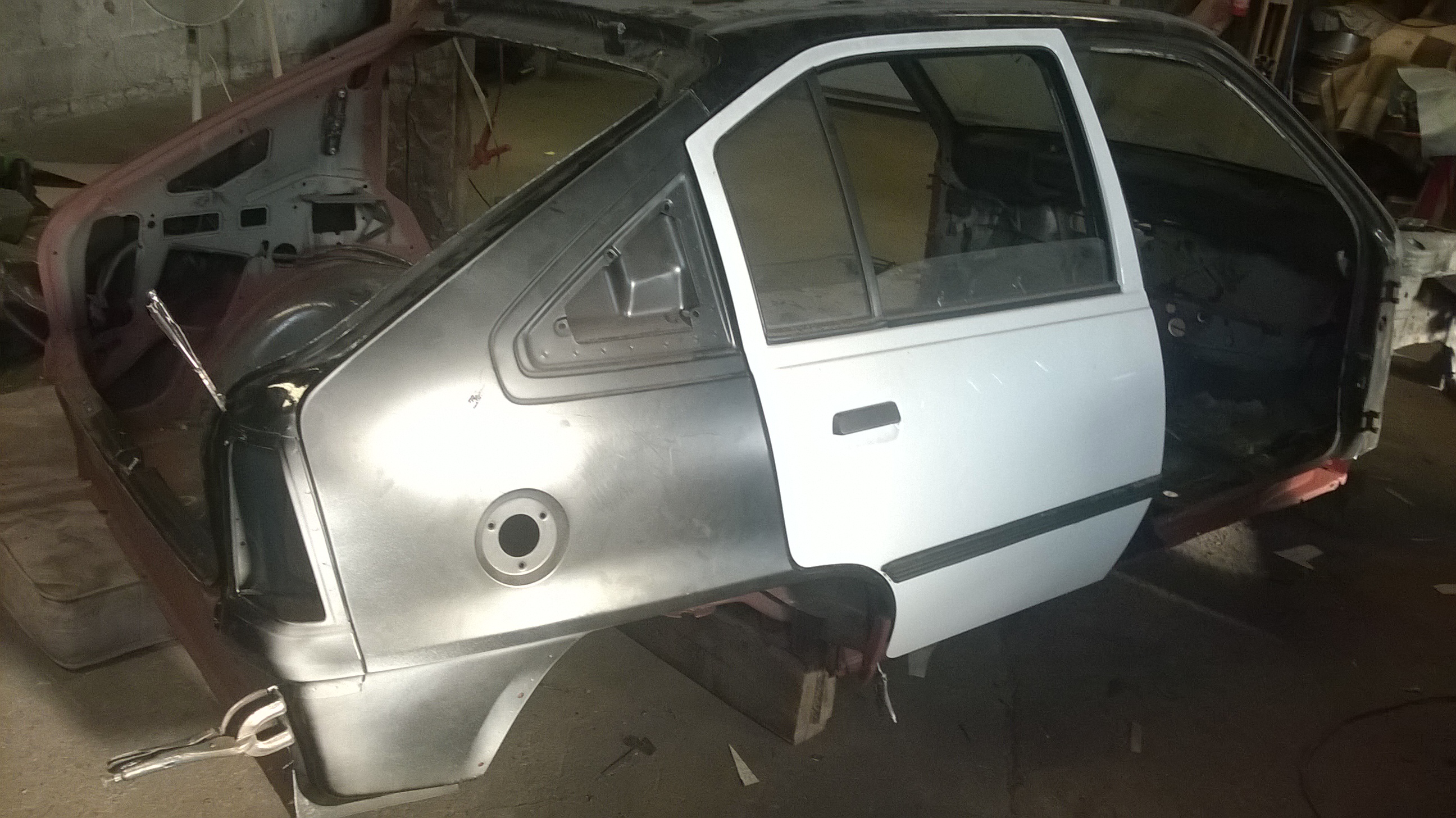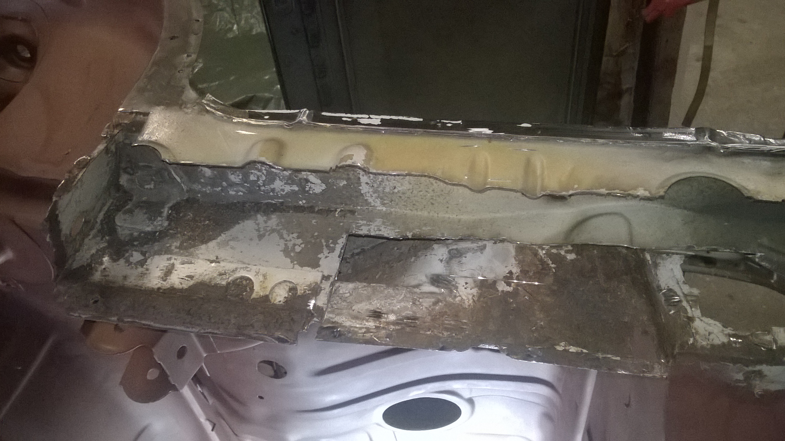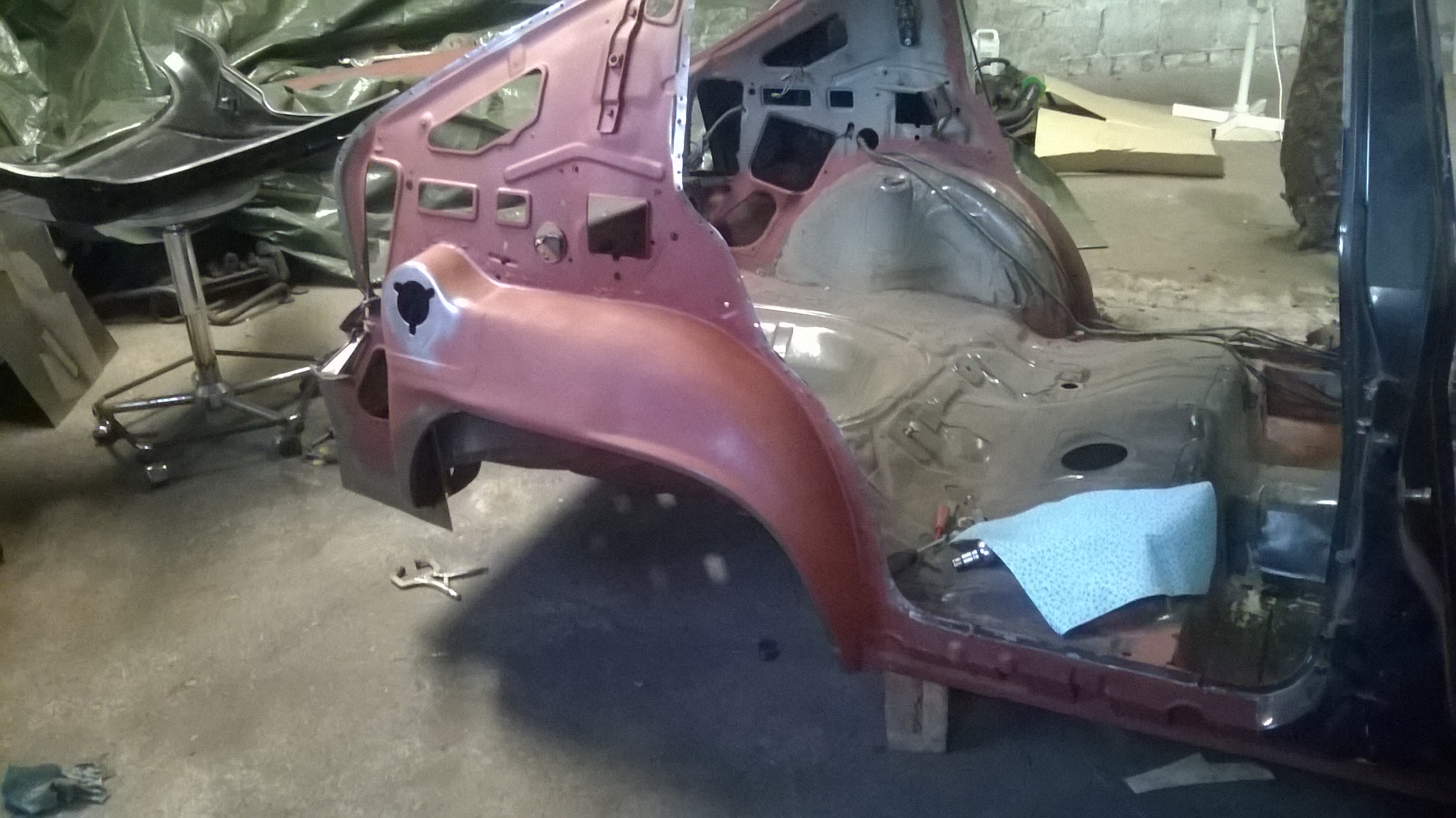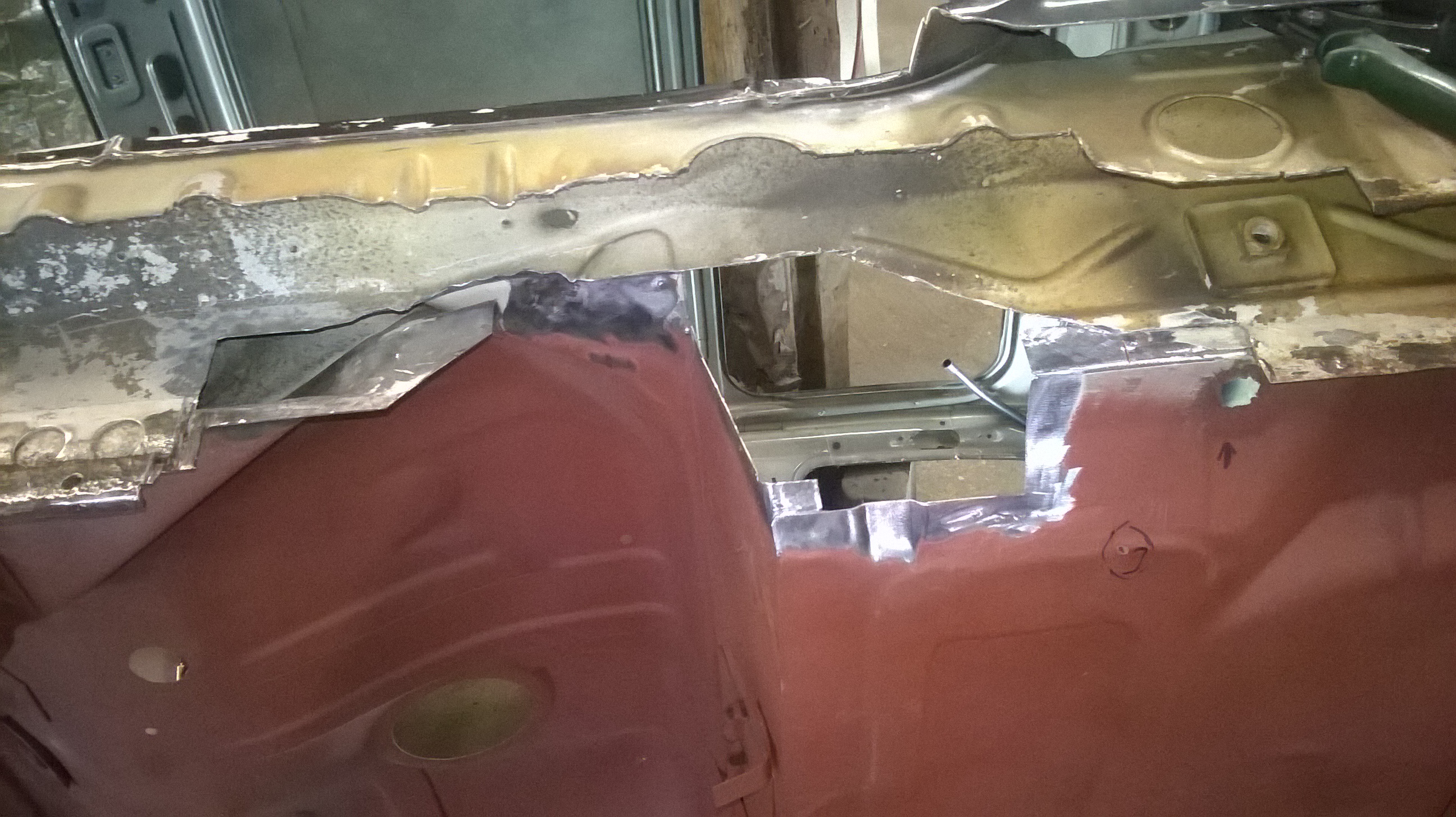 Nachdem ein Schrauberkollege gekommen ist konnten wir den Kadett wieder normal umdrehen, damit ich den Radkasten und die Seitenwand anpassen und einschweissen konnte. Nach vielem ausrichten musste ich aber erstmal ein paar Blechschrauben setzen zum fixieren der Teile. Das ermöglichte dann auch das abnehmen der Seitenwand ohne Radkasten.