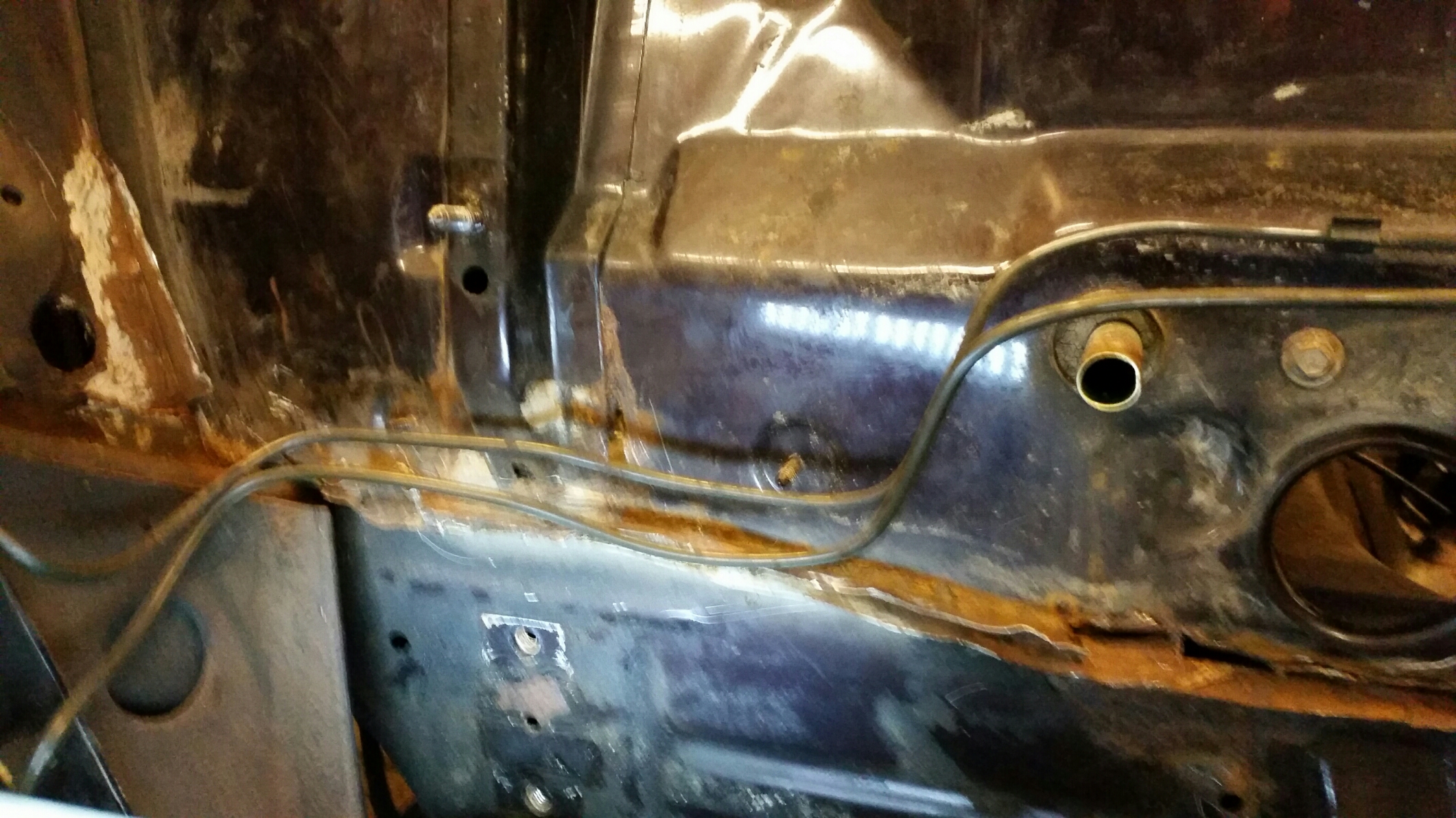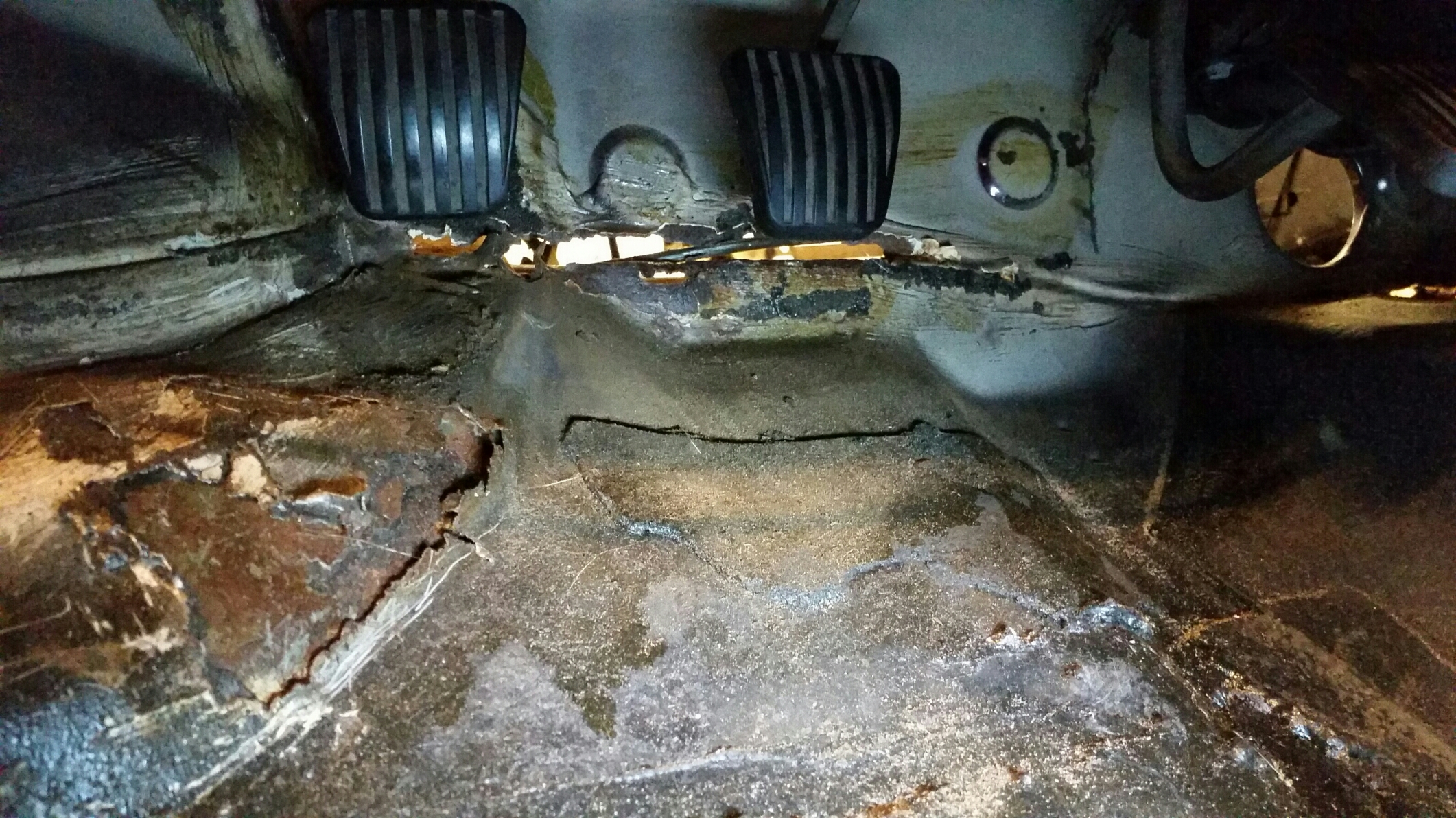 Erwartungsgemäß bin ich fündig geworden, leider mehr als ich gehofft habe. Insbesondere an der Stirnwand zum Fußraum hin ist es ordentlich vergammelt. Das scheint mir in Verbindung mit der Dämmmatte, die die ganze Feuchtigkeit sammelt und der hier zusammenkommenden Bleche eine prädestinierte Stelle zum gammeln sein.