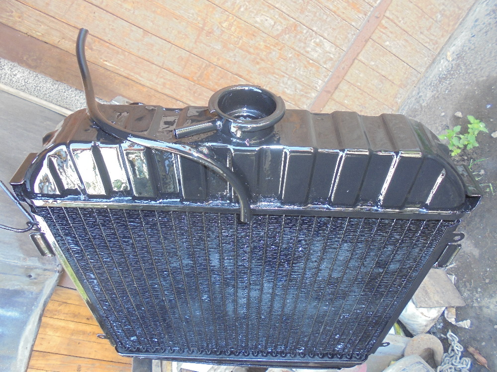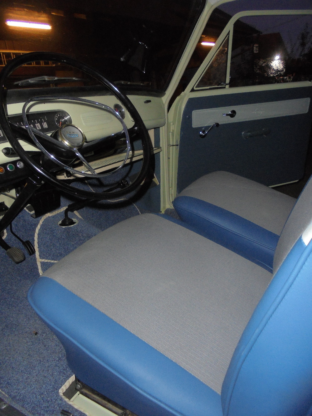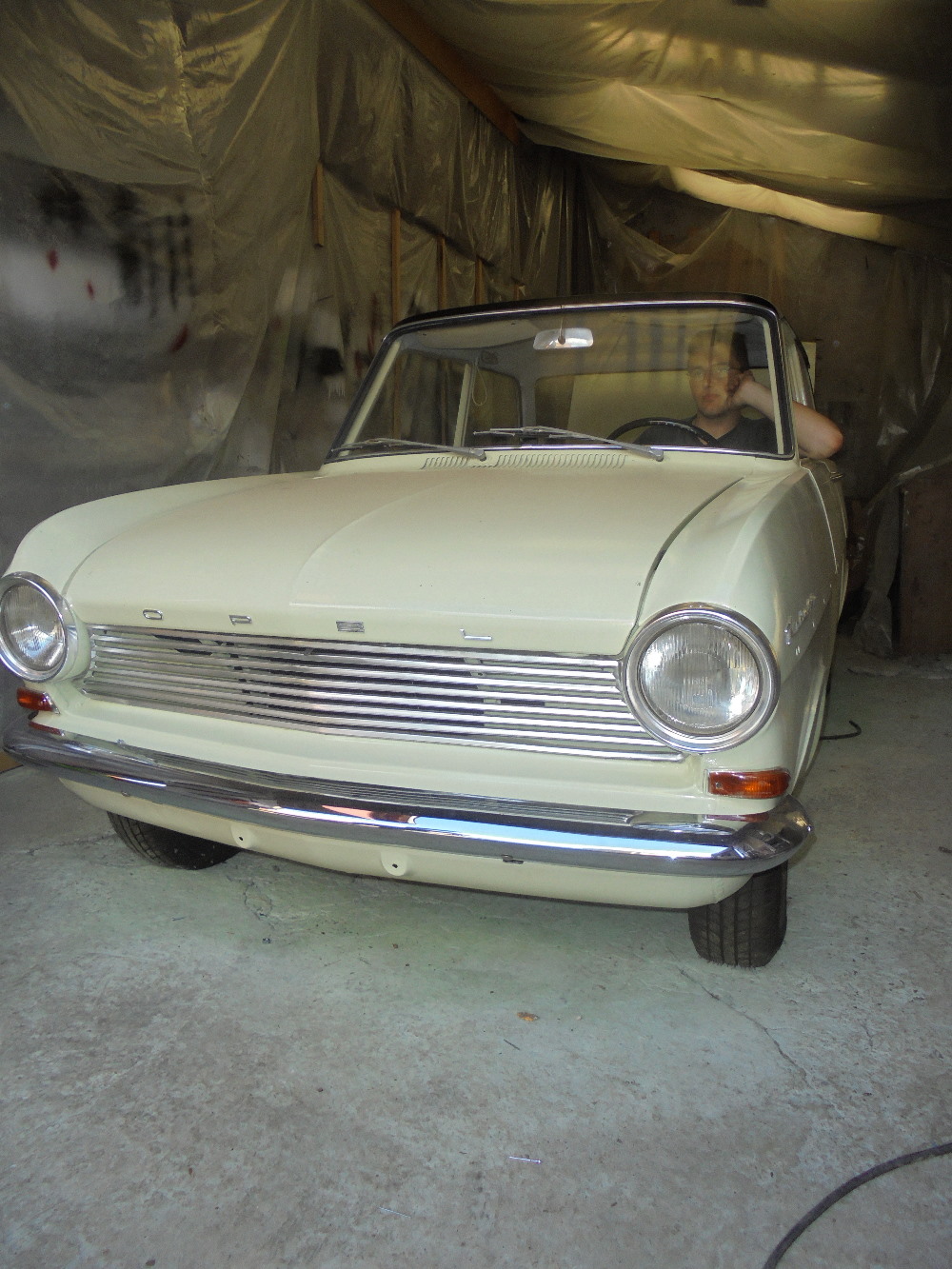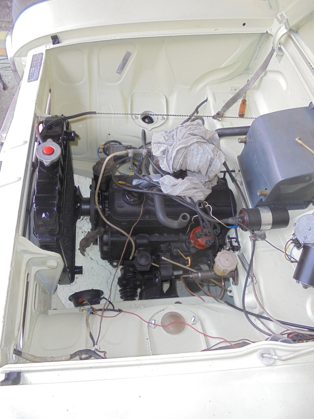 Die Sitze sind neu bezogen, der neue Teppich ist genäht, Benzinleitung verlegt, Kühler gerade gebogen, Kühlerjalousie gereinigt, Bremsleitung vorne drin. Fensterhebemechanixnutz und Türschlösser am Platz, Scheinwerfer und Blinker eingebaut, Auspuf geschweißt, Stoßstangen dran....