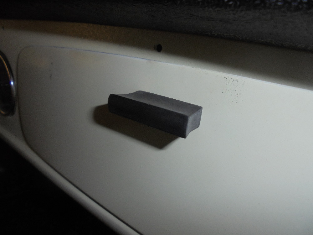 Was mich schon lange geärgert hatte war das Verschwundensein, des kleines Griffes am Handschuhfach. Als repro habe ich ihn nur ein einziges mal gefunden, aber der Preis war mir zu hoch. Hierfür kann ich mich auch hinstellen und ihn selber aus dem Vollen schnitzen.