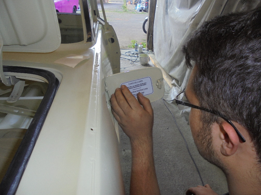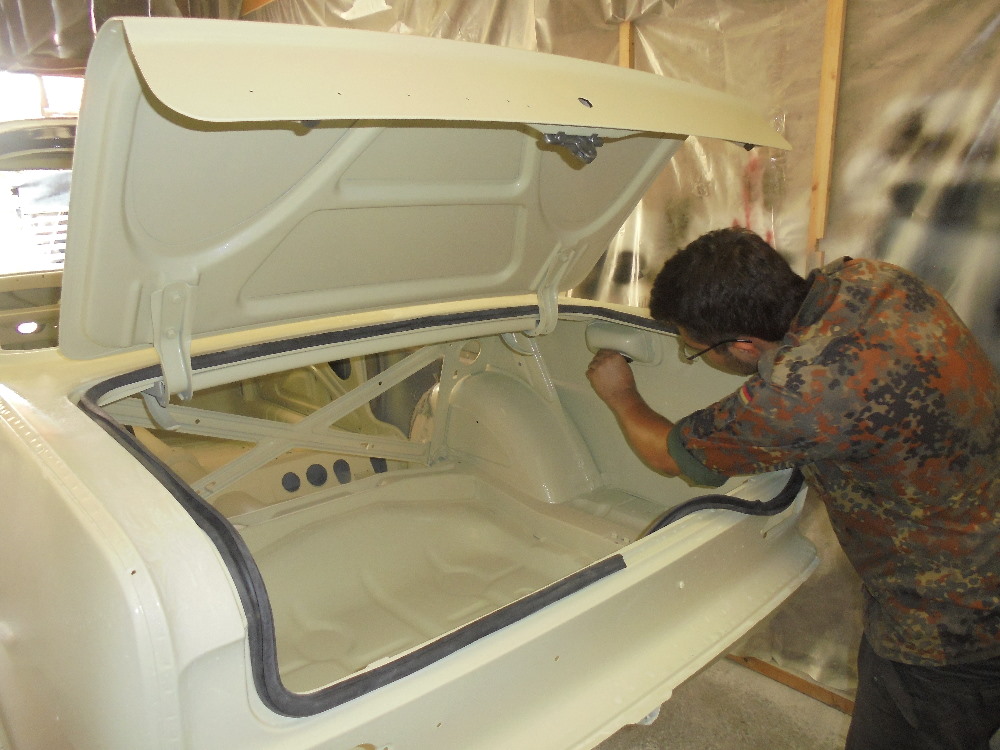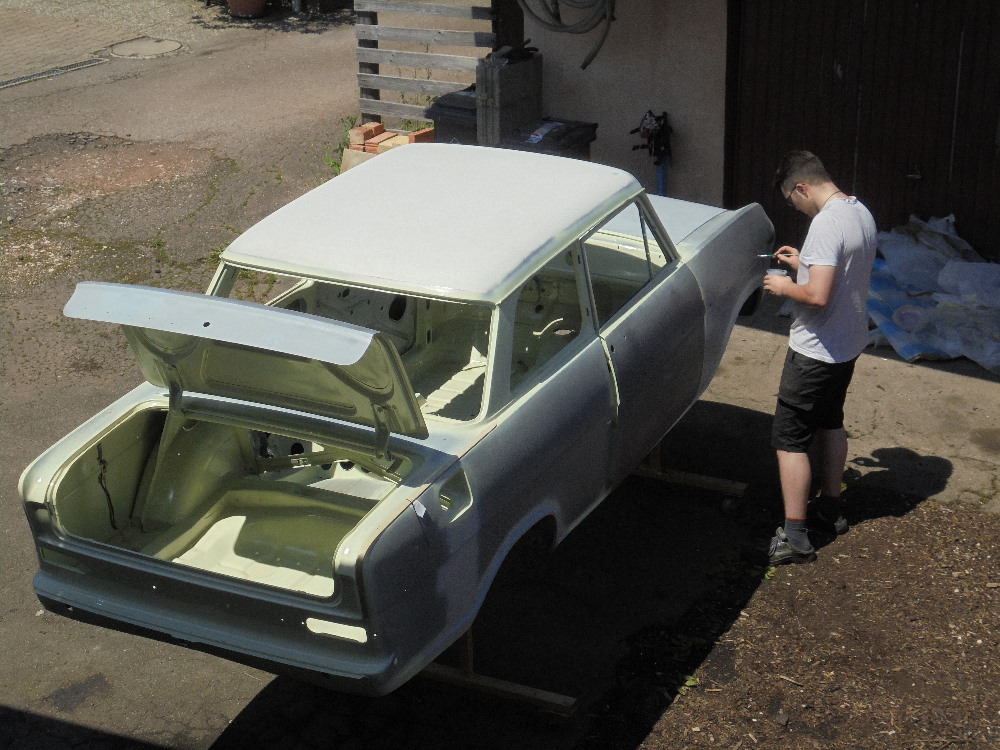 Lackieren wollten wir selbst - nie vorher ein ziviles Fahrzeug lackiert, aber man traut sich ja alles zu. Also alles abgeschliffen, grundiert gefüllert naßgeschliffen etc. Die Lackierkammer gemietet, Farbe gekauft und das Auto in die Lackierkammer gebracht. "Alexandra, wasch noch mal alles schön ordentlich mit Silikonentferner ab. Wir gehen einen Kaffee trinken und kommen wieder zum Lackieren!"