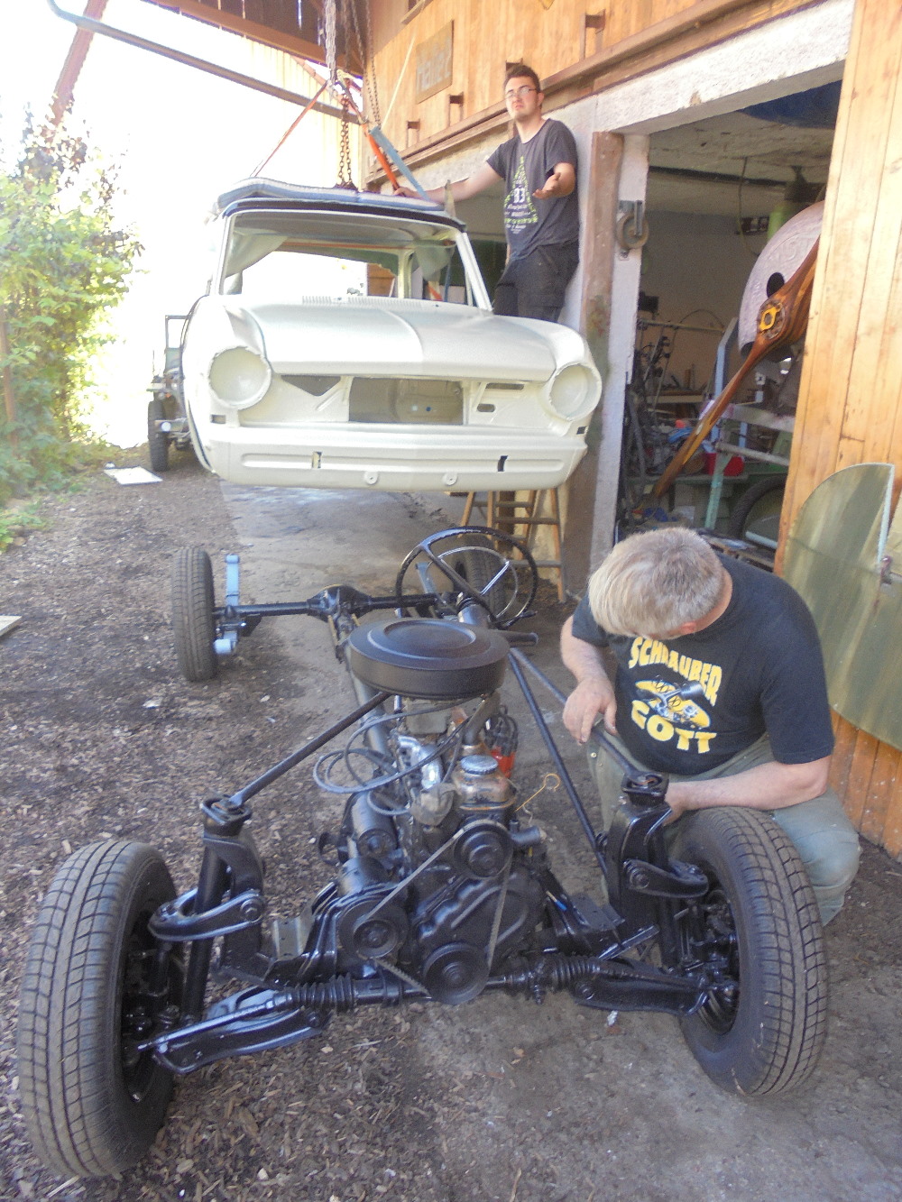 Ich habe ihn dann meinem Sohn Jannik geschenkt, damit er ein Auto hat, wenn er 18 wird. Das wäre nächstes Jahr. Bedingung war, er sollte selbst restaurieren. Und so lag das Wägelchen einige Jahre in der Ecke. Dann plötzlich hat der junge Mann Interesse entwickelt und richtig losgelegt. Er hat die Blecharbeiten gemacht und ich alles eingeschweißt.