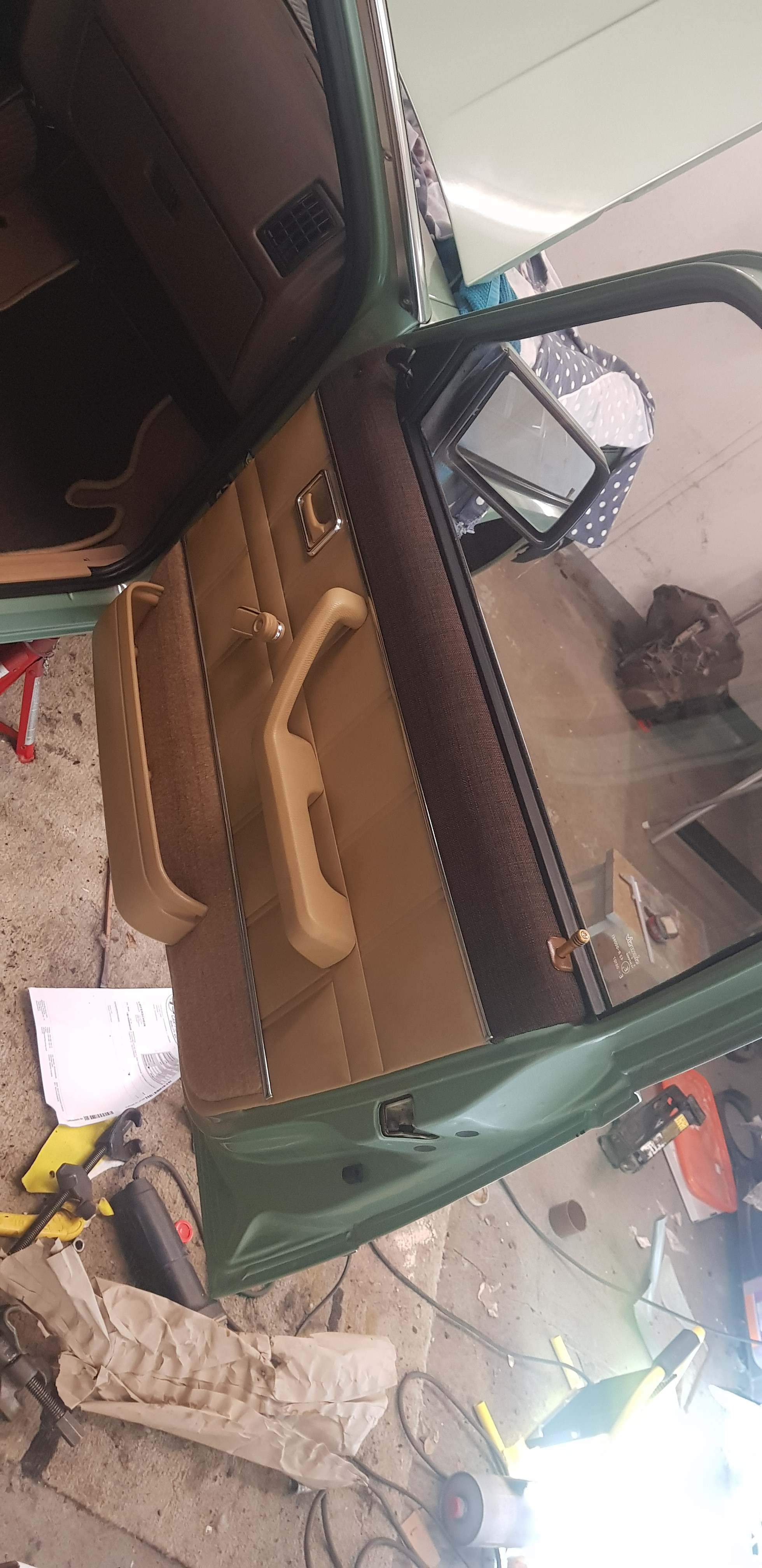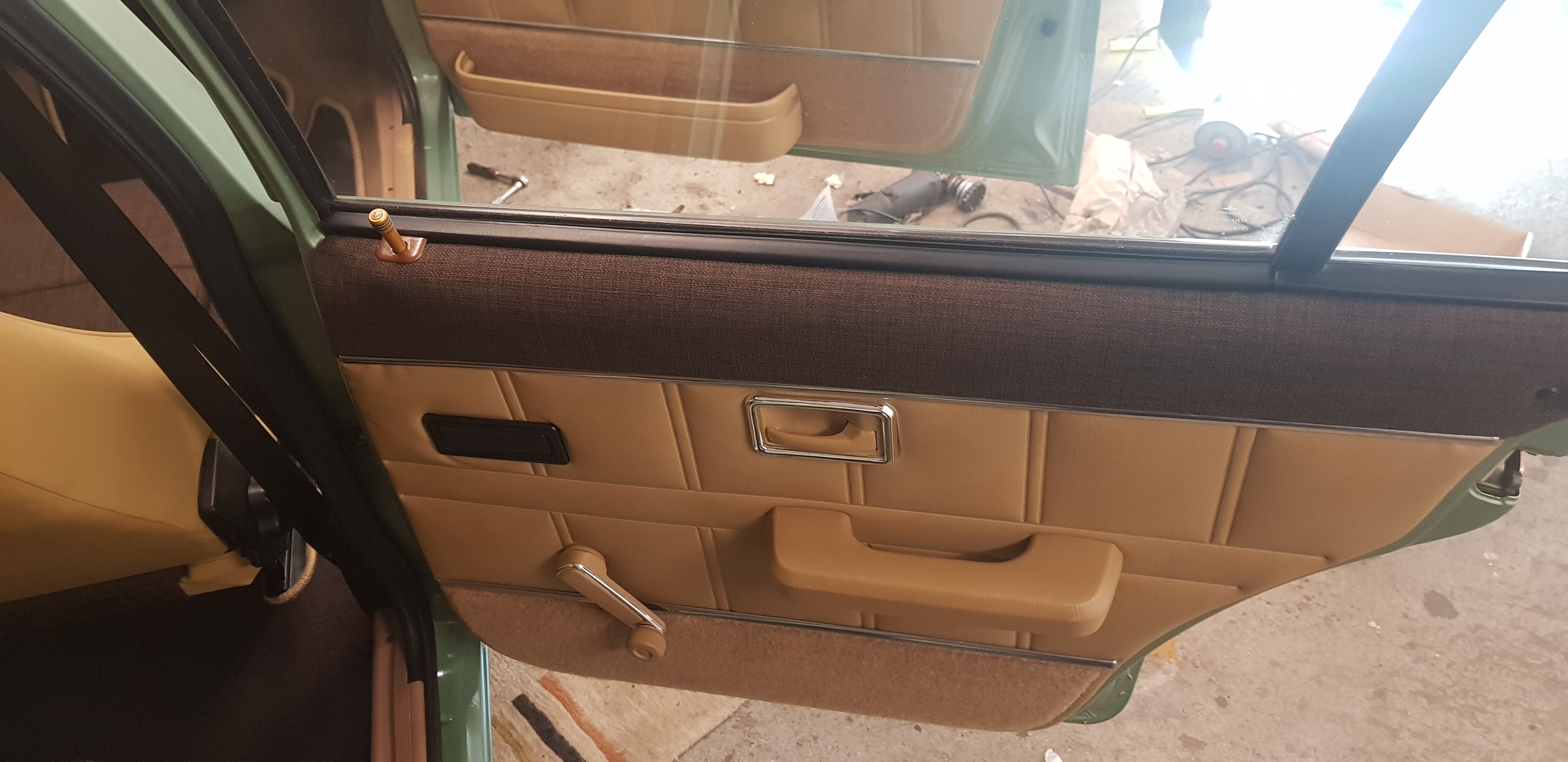 Na die Türverkleidungen werden im oberen Bereich bis zur Chrom Leiste in dem dunklen Bezug von den vorderen Sitzen bezogen .