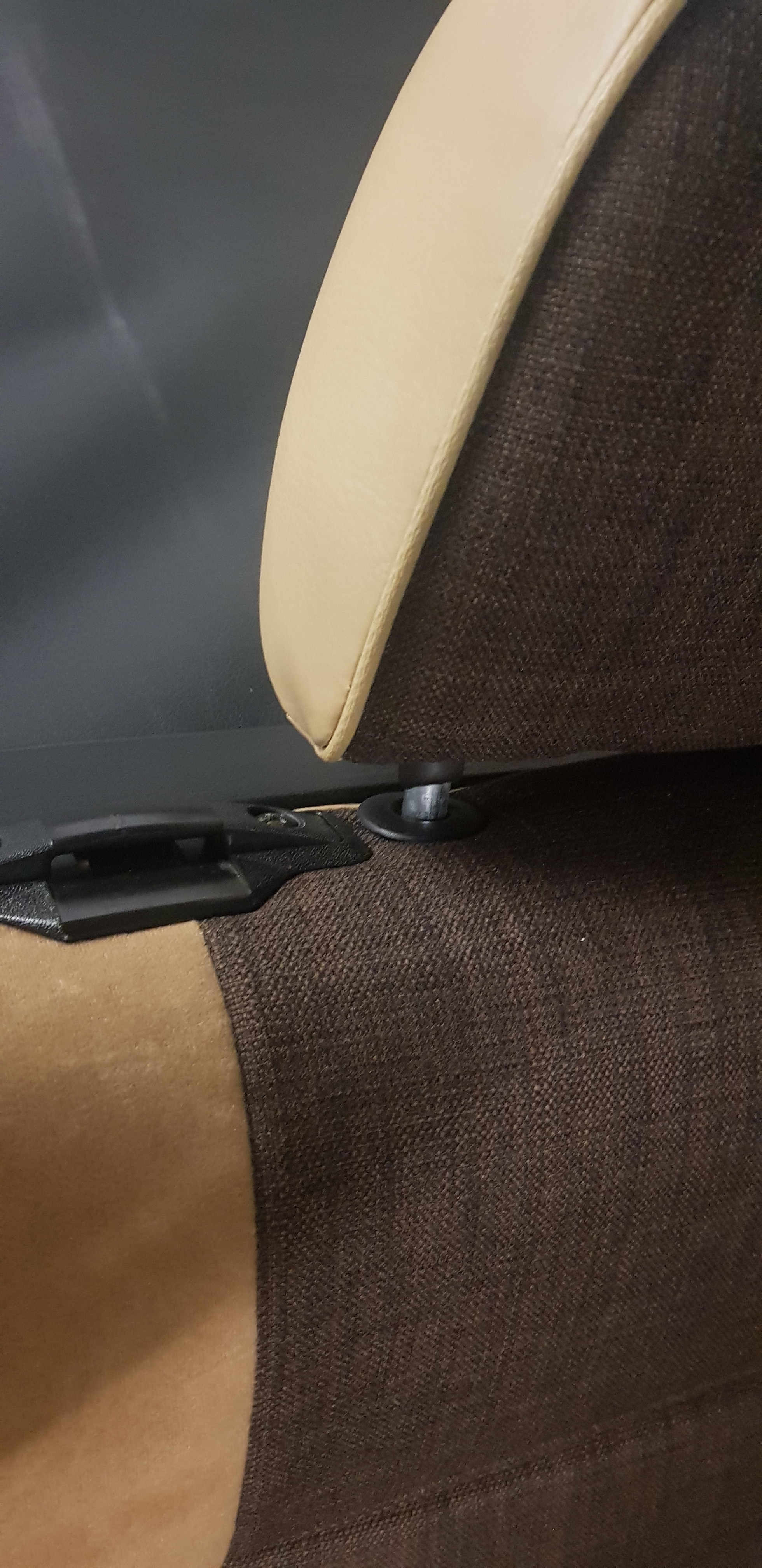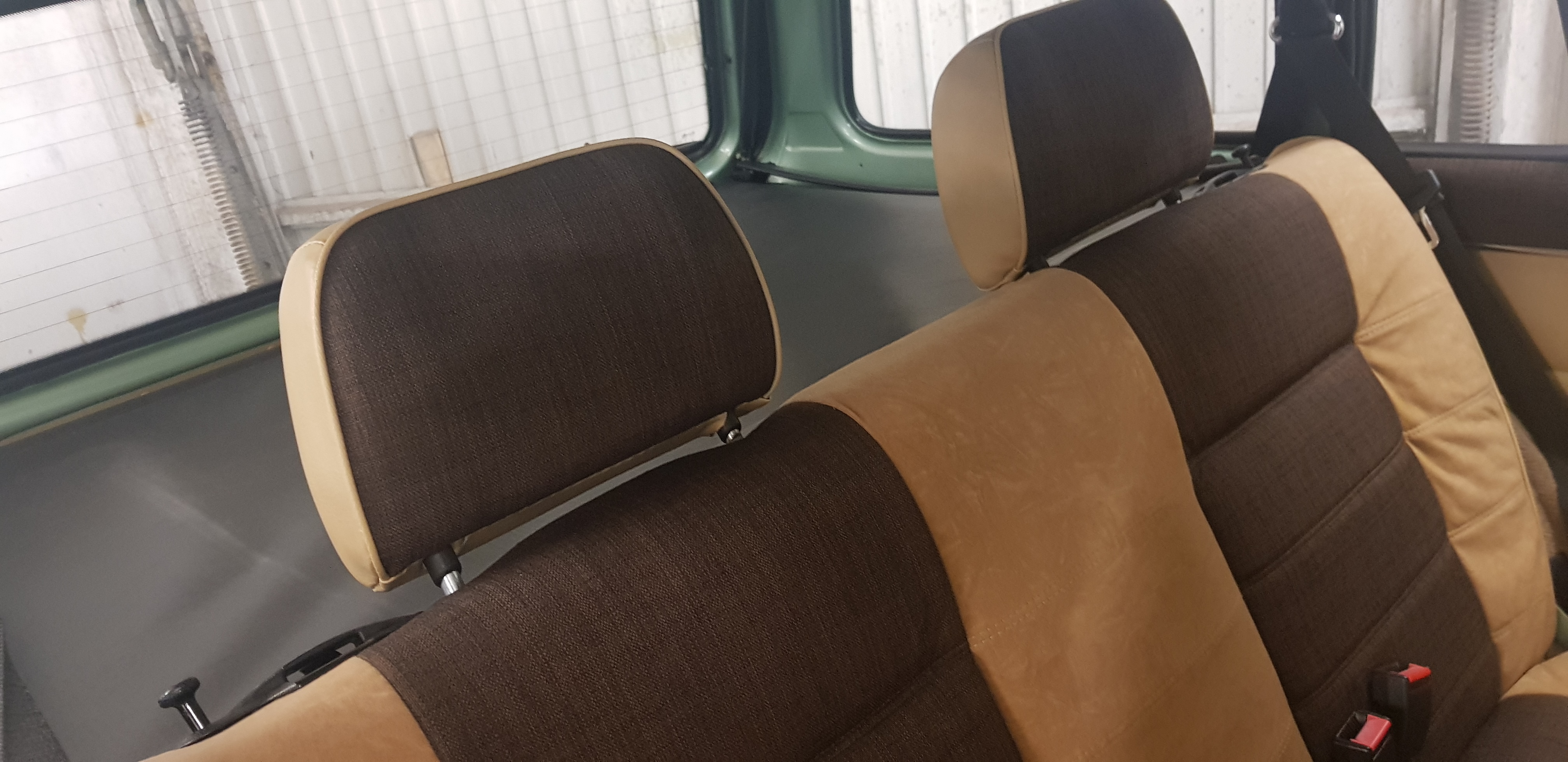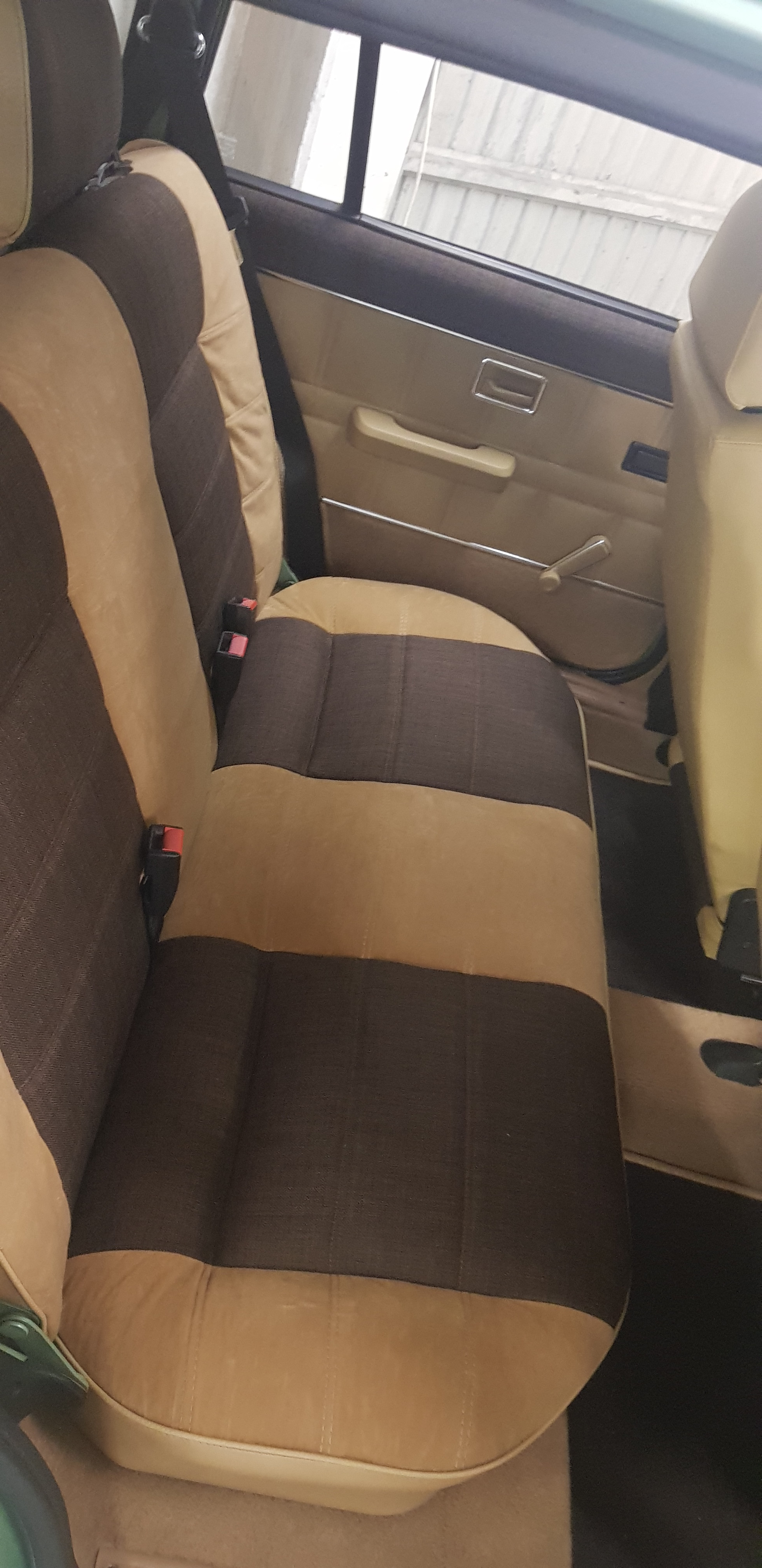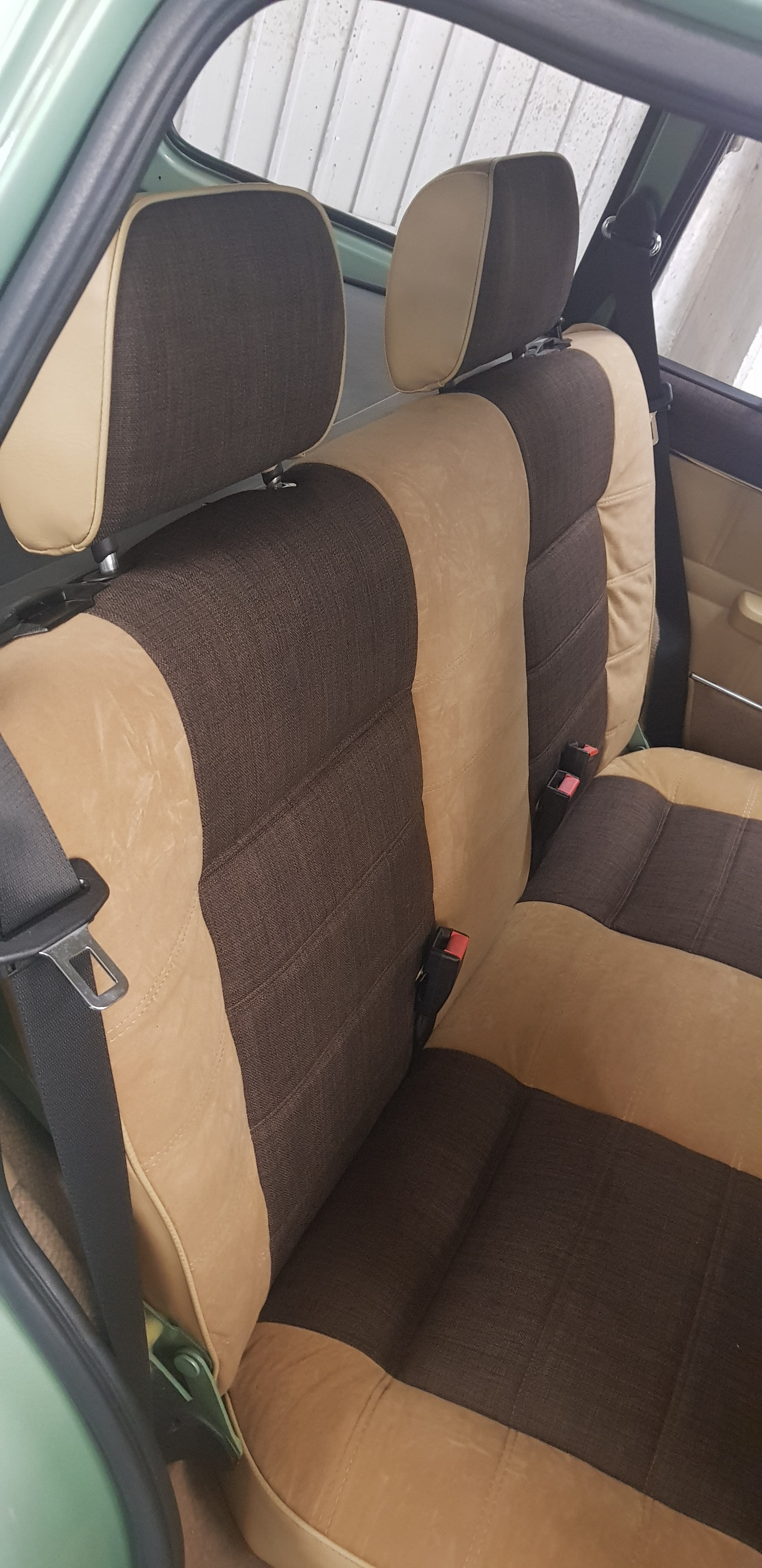Die Rückbank bekommt 2 Dunkle Streifen wo man sitzt von unten nach oben , und sie bekommt noch 2 Kopfstützen die dann vorne auch in dem dunklen Stoff wie der Rest bezogen werden .