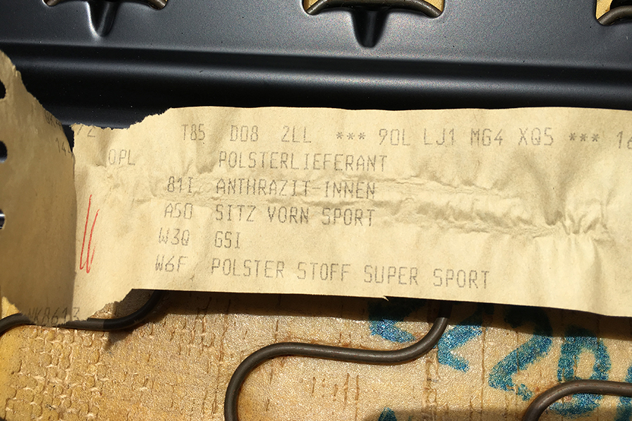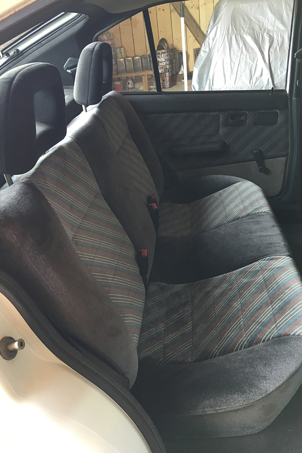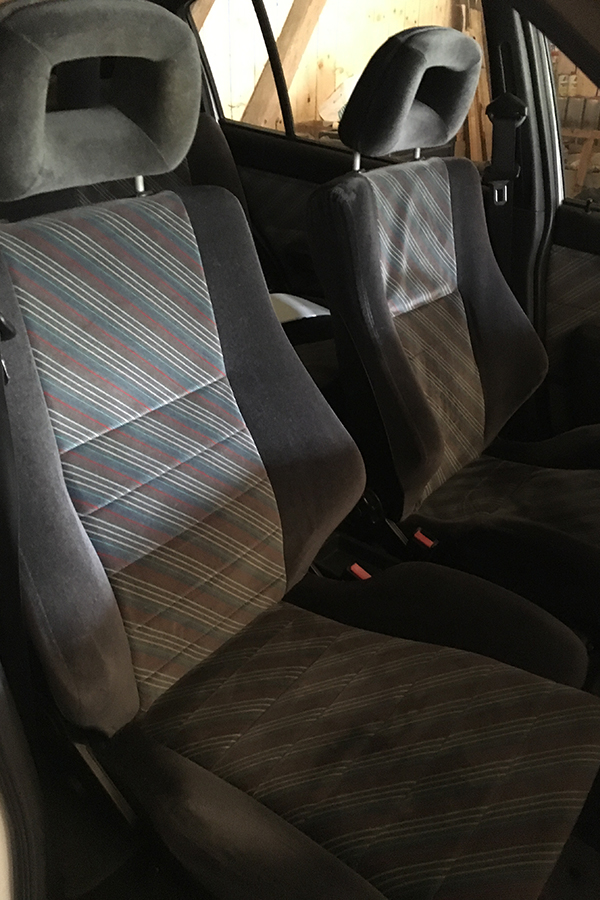 Zum Schluss noch die Sitze. Der Beifahrersitz ist aus meinem 5-Türer 16V und der Fahrersitz ist von der gekaufen Ausstattung. Der Fahrersitz ist leider auch schon ein bisschen durchgesessen, deshalb werde ich im Winter noch den durchgescheuerten Fahrersitz aus dem 5-Türer aufpolstern lassen. Dafür habe ich von 16V 1000er schon passende Bezüge bekommen.