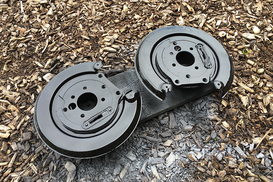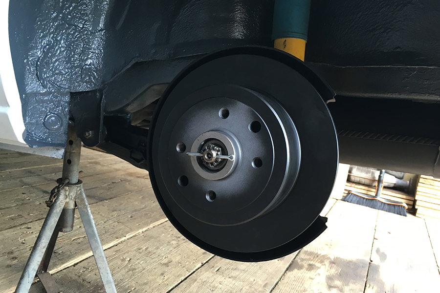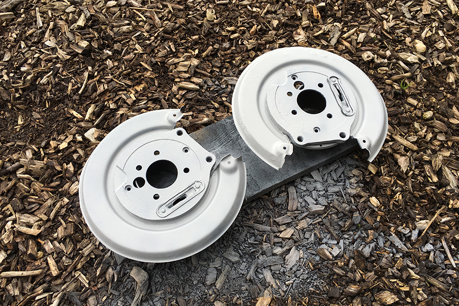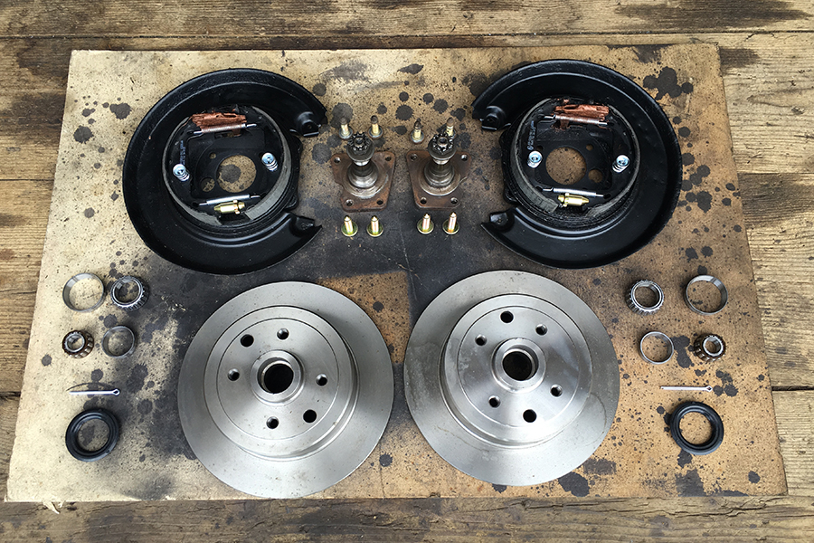 Das ging ziemlich fix. Anschließend habe ich die neuen Lagerhülsen in die neuen Bremsscheiben eingesetzt und alles für den Anbau an die Achse vorbereitet.