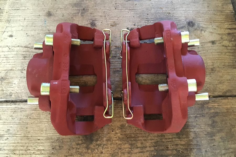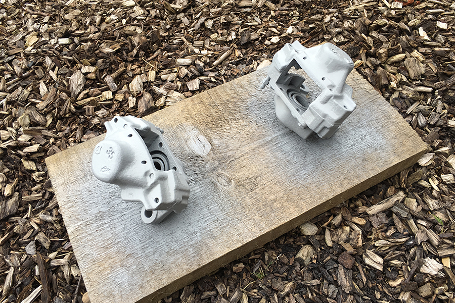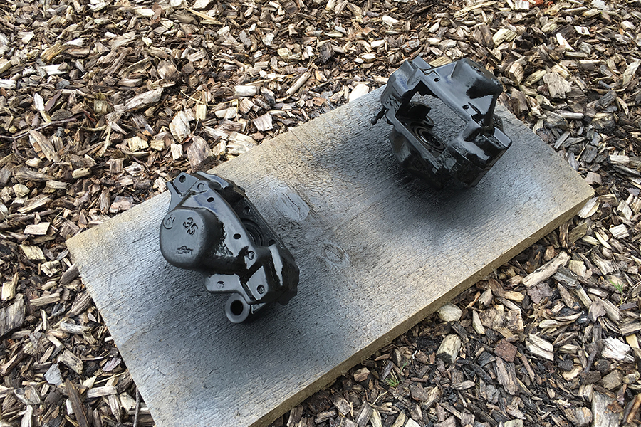 Zum Thema Federbeine etc. gehört auch die Bremse für vorn. Da wird es die FN54 Bremse mit 284x24mm Scheiben in 4x100 werden. Die Sättel und Halter wurden sandgestrahlt und grundiert. Der Rest kam aus der Kiste mit den frisch chromatierten Teilen.