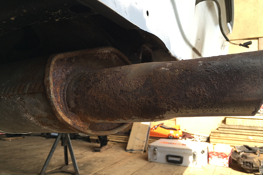 Da ich schon so gut am Entrosten war, habe ich mich auch der Auspuffanlage gewidmet. Es ist übrigens ganz gut, dass ich den MSD und ESD nicht voneinander lösen kann, denn so bleibt er schön gerade und kann sich nicht verdrehen.