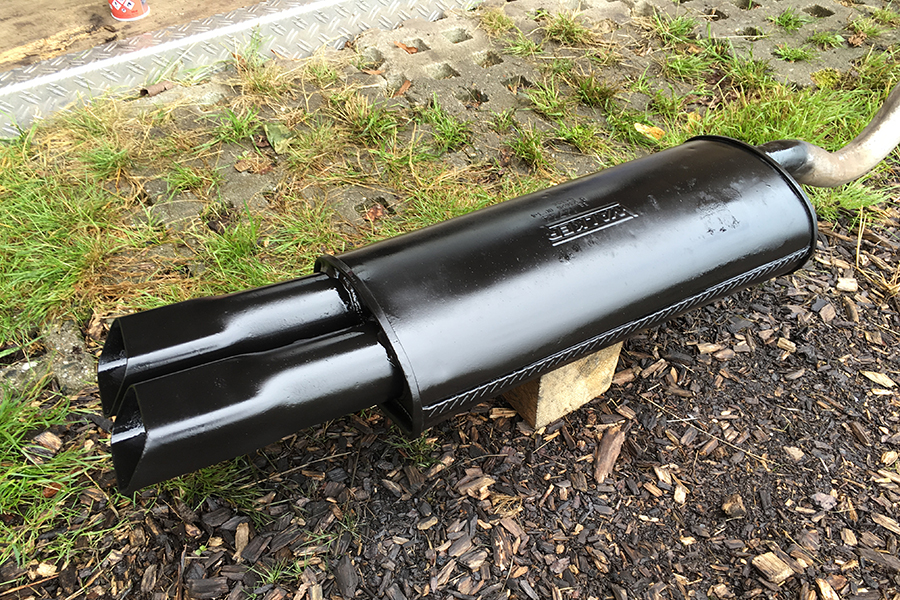 Also alles schön mit Auspufflack in Mattschwarz lackiert. Ich habe mich bewusst für Mattschwarz, auch bei den Endrohren, entschieden, da diese am Kadett GSi 16V original auch schwarz waren.