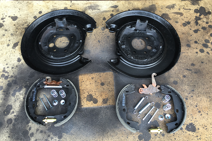 Danach ging es an die Ankerplatten. Die neuen Bremsbeläge für die Handbremse inkl. Anbausatz mussten ran.
