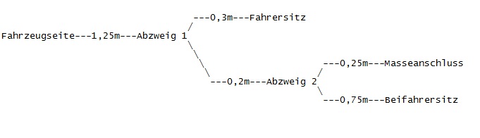 Länge Leitung braun 1: ca. 0,75m Masseansluss---Abzweig 2---Abzweig 1---Fahrersitz