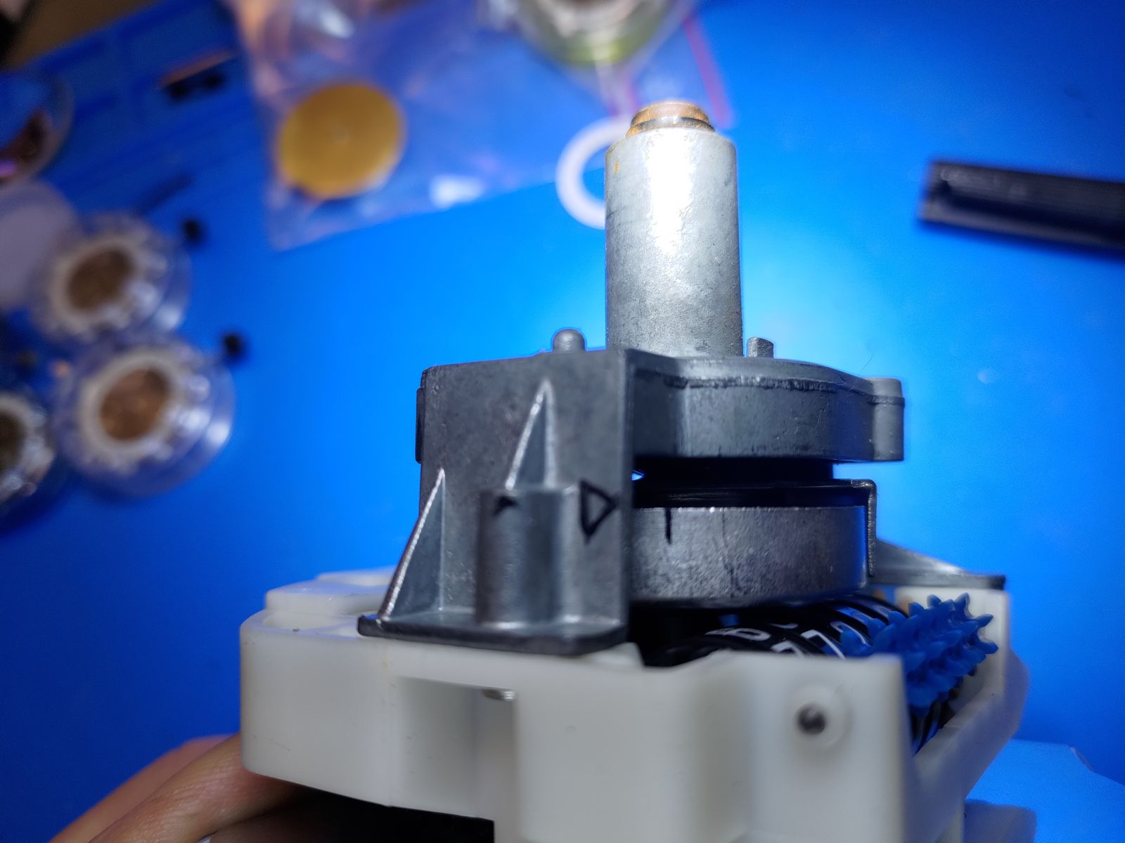 Hier habe ich die Nullstandsfinger bereits ausgebaut. Es gibt so diesen kleinen Plastikfeder/haltern, der sich einfach mit einen Schraubendreher losen. Hier unter, ganz rechts unter. Als sich diesen "Feder" eingedruckt wird dan kann das ganze Nullstandsmechanik hochgezogen worden, und ganz entfernt als beide Seiten gelost sind.