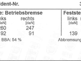 Abweichung der Bremsleistung links/ rechts Betriebsbremse Vorderachse 5% und Hinterachse 1%.