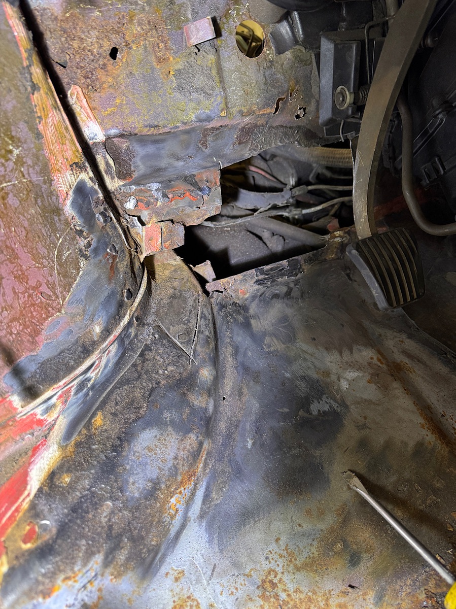Heute erstmal alles rausgetrennt, was nicht mehr zu retten war. Es gab einen früheren Reparaturversuch, mit zahlreichen und möglichst kleinen Blechflicken, die hab ich alle rausgeholt. Jetzt habe ich schon mal eine Spritzwand ohne Altlasten.