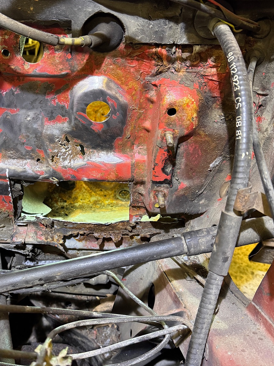 Irgendwann mal hat dann auch jemand herausgefunden, warum er immer nasse Füße bekommen hat, und hat dann, mehr schlecht als recht, versucht vom Innenraum her, hinter Pedalen und Lenksäule, die Löcher zuzubraten. Noch reichlich U-Schutz oder sowas drauf und gut is…