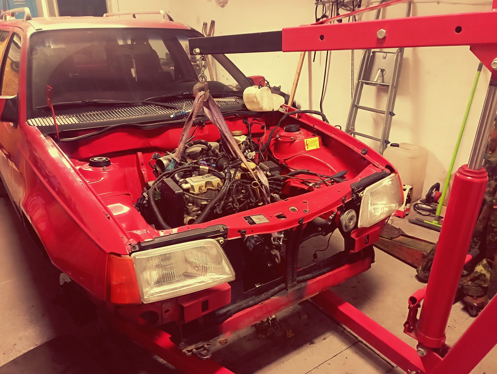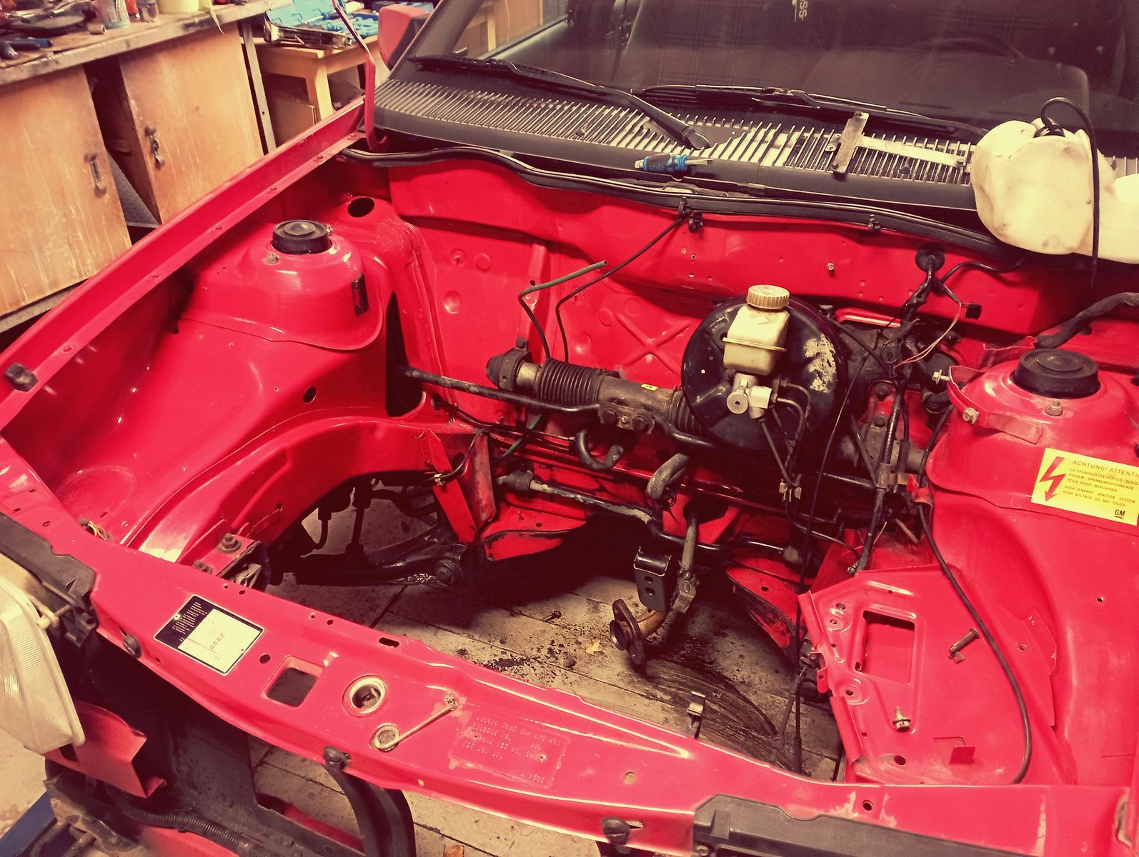 Also Schlachtplan erstellt und Teile gesammelt. Kühler vom 1,8S in neu, einen Kat vom Astra OPC wegen der Form weil ja der Platz knapp ist, einen Endschalldämpfer vom Astra (Fehlkauf), Rohrmaterial, einen passenden Silikonschlauch zum Luftfilterkasten usw. Zu viel um das gerade aus dem Gedankenprotokoll wiederzugeben. Als erstes war der Plan die Benzinversorgung fertig zu bauen und da sind wir am größten Knackpunkt dieses Projektes angelangt. Die Leitungen habe ich wie üblich von 4/6mm auf 8/10mm Kunststoffleitungen umgebaut. Das klappte nahezu Reibungslos. Was ich mir die ganze Zeit nicht vor die Augen gehalten habe ist die Größe des Kraftstofftanks...ich habe dank meinem Baujahr die alte Bodengruppe mit dem kleinen (Kadett D-) Tank und wollte jetzt auf den großen Kadett E-/Astra F Tank umbauen und da sagte meine Karosserie nein. Tankfangband vom vVFL Fahrerseite ist um Ca. 6cm weiter nach innen versetzt in Gegenüberstellung zu Version mit dem neuen Tank sowie sitzt der Bremsleitungshalter auf der Fahrerseite genau dort wo dann der neue Halter füs Fangband hin muss und Beifahrerseite ist der Halter weiter hinten. Was machen? Natürlich, da ich dieses Auto nicht mehr hergeben werde und nach wie vor keine Außentankpumpe fahren wollte, mussten die Halter umgeschweißt werden. Jetzt kommt wieder das erste Fahrzeug aus diesem Thread zu Zuge. Dieser hatte die Halter und Bänder die ich bräuchte sowie das entsprechende Tankzuführrohr. Also Ran, Bleche ausgeschnitten und Halter abgepunktet. Vorbereitet und an meine Karosserie angepasst und angeschweißt. Dazu könnte ich den Innenraum wieder zerlegen. Während mein Schweißer die Halter angeschweißt hat, habe ich im Innenraum die Schweißpunkte mit Druckluft gekühlt. Alle Schweißpunkte wurden im Nachgang mit Schutzspray versiegelt, ich muss aber noch alles vernünftig überlackieren.