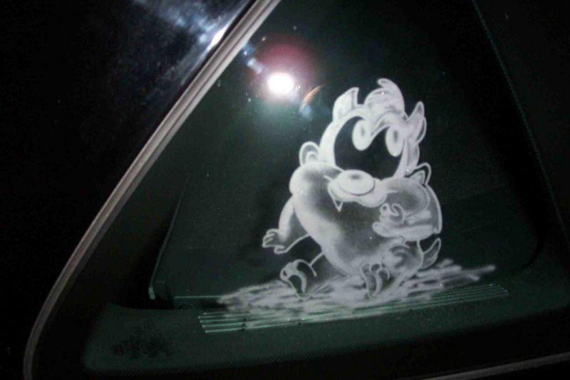 Ich strahl auch seit zwei jahren selber, hab mir ne Airbrush-Pistole umgebaut, kannste feiner mit arbeiten als mit ner großen Sandstrahlpistole, aber ne grosse tut´s auch. hier mal ne Kostprobe, Junior des Tazmanischen Teufels, is bei meiner Schwester auf der A-Klasse.