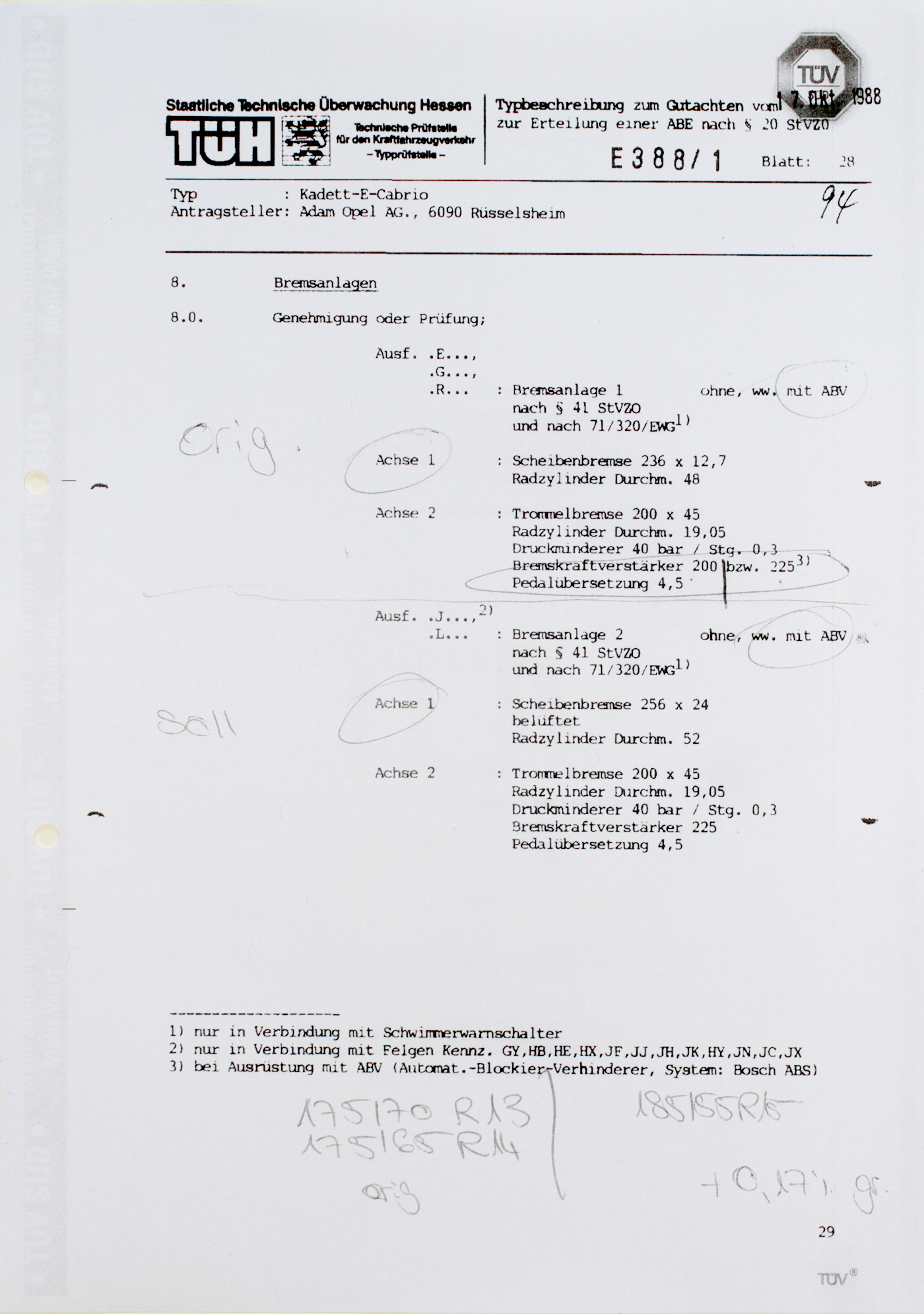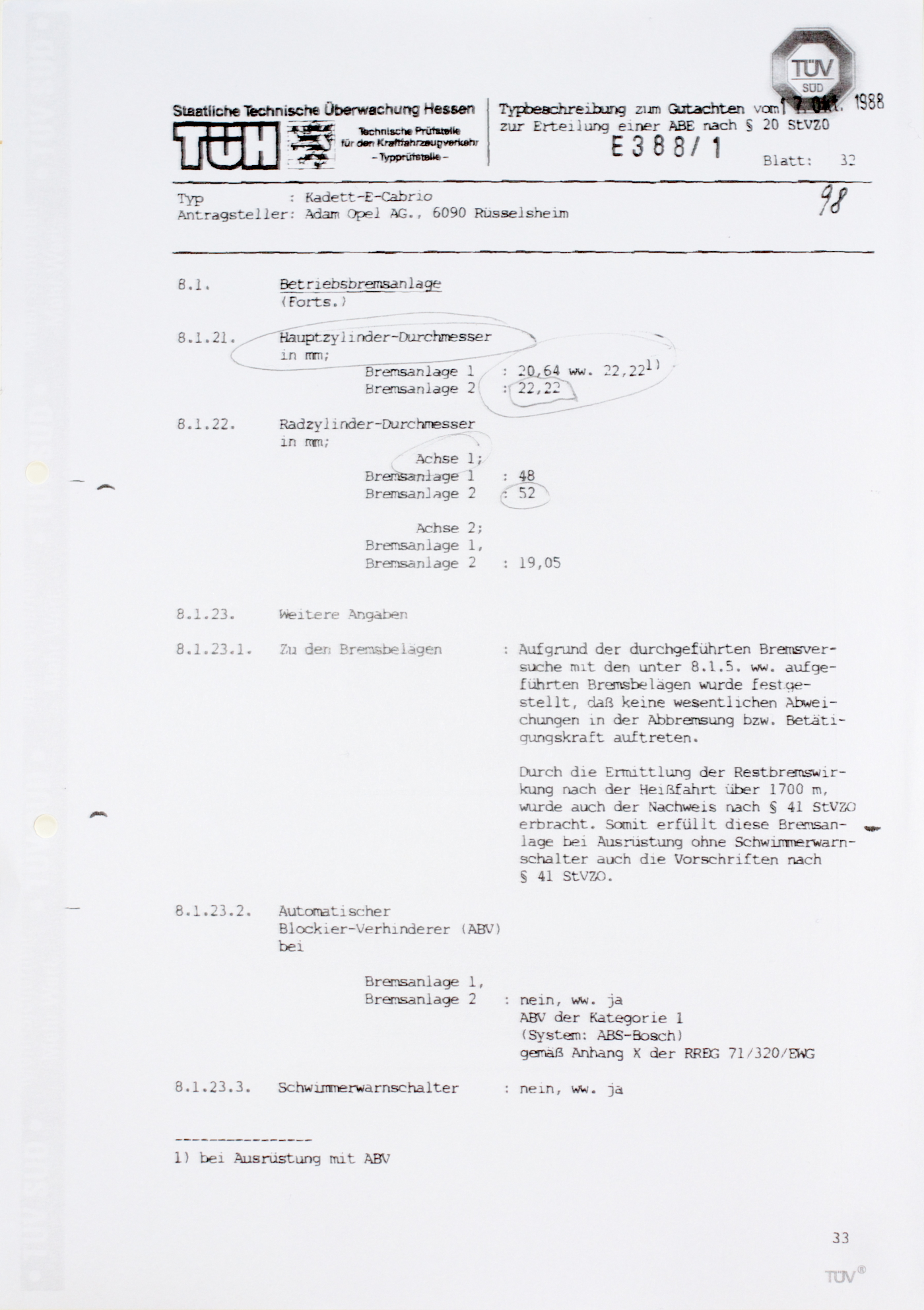 Ja ich habe die Seiten der ABE zur Bremsanlage. Allerdings bringt dir das nur etwas, wenn dein Wagen nach E388/1N4 zugelassen ist. Gab ja diverse Nachträge, schau mal in deinen Fahrzeugschein was da steht.