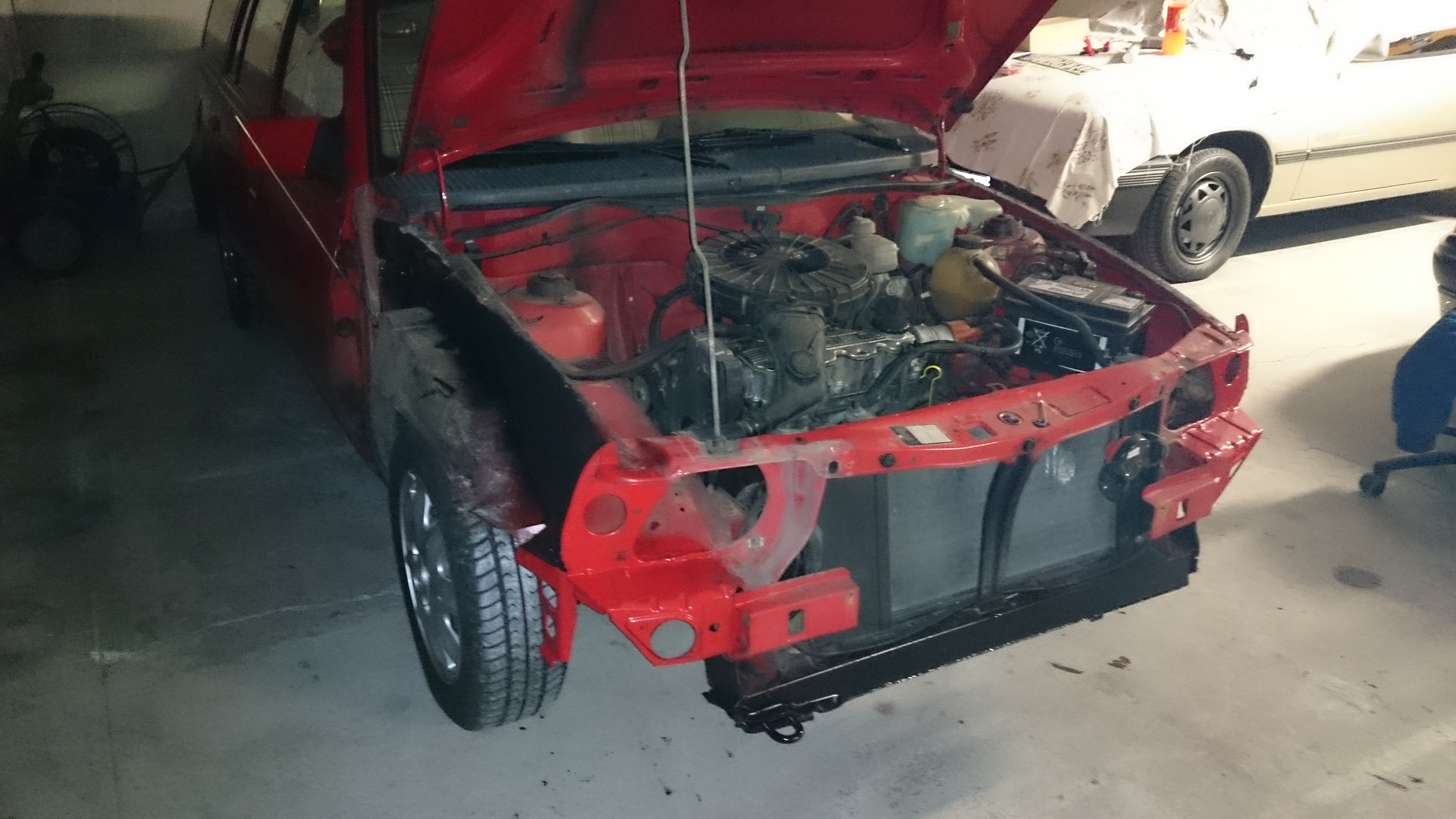 Die hinteren Wagenheberaufnahmen waren weggerostet, die Kotflügel komplett durch und die Stoßfänger mit Stoßstangenschwarz vollgeschmiert.Als erstes habe die Wagenheberaufnahmen geschweißt und die Front zerlegt. Den Vorderwagen entrostet, versiegelt, dann zwei brauchbare Kotflügel besorgt und angepasst.