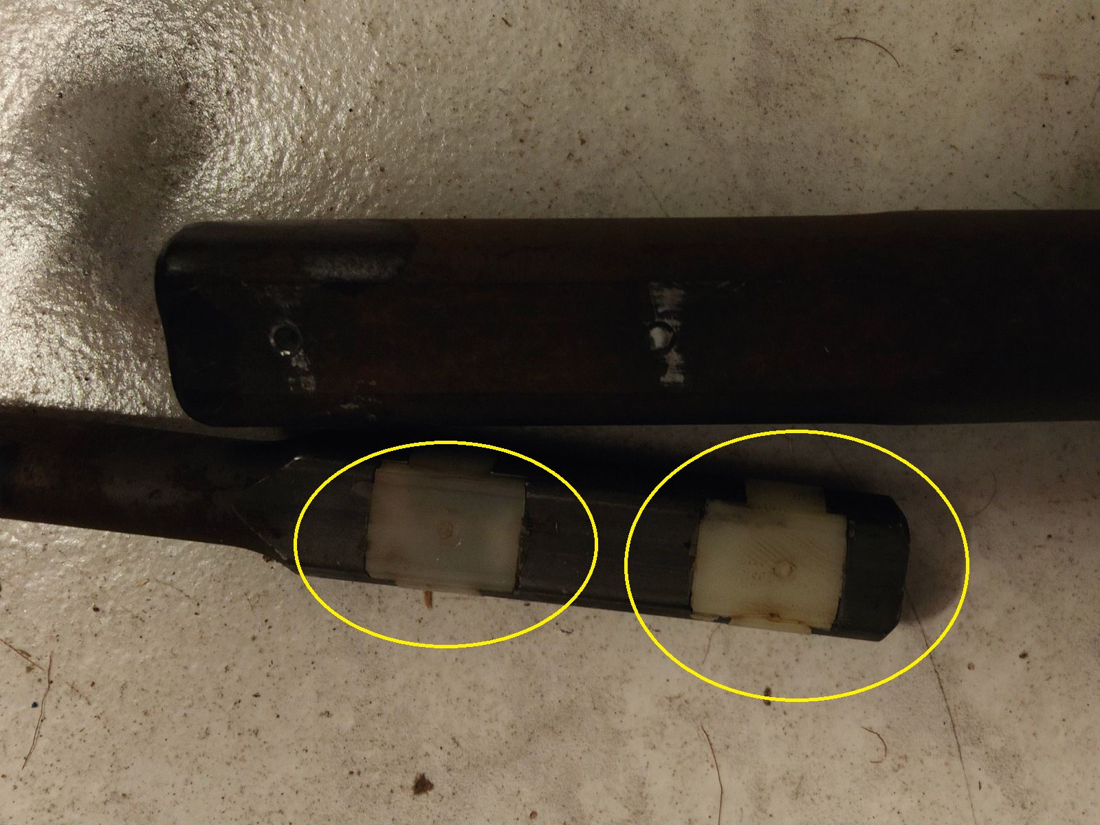 Ich hab mich da heute mal mit jemandem von unserem Kunststofftechnikern unterhalten (Arbeite ja in einer Universität). Die Kunststoffteile der Sicherheitslenkung wurden damals bei diesem System so gefertigt: Ein Spritzguss geeigneter Kunststoff wurde bei Gießtemperatur mit hohem Druck durch die beiden Löcher eingespritzt, wodurch die Teile sozusagen mit der Lenksäule als Form gegossen wurden. Die beiden überstehenden Scherstifte aus den Bohrungen wurden im warmen Zustand meist händisch verpresst. Funktionsrelevant bei der Kadett-Lenkung sind nur die beiden von mir im Bild markierten Bereiche, die ein Spiel der beiden Bauteile in Drehrichtung verhindern. Die angegossenen (bei dir gebrochenen) Zapfen (Scherstifte) sind im Prinzip nur eine Einbauhilfe, damit die richtige Länge automatisch vorgegeben ist. Wenn man sich die Konstruktion ansieht wird man auch sehen, dass die beiden Zapfen nichts ausmachen, der sicherheitsrelevante Vorgang ist das Zusammenschieben des Lenkstützrohres. Der Spritzguss(vermutlich Polypropylen) hat im Regelfall eine Zugfestigkeit von ca. 30/mm², also fast nichts. Das Lenkstützrohr ist das Gitterrohr um die eigentlich Lenkstange, dieses Schiebt sich bei überschreiten einer gewissen Kraft zusammen und gleichzeitig wird die "Lenkstange" in sich zusammengeschoben. Durch das Lenkstützlager (sitzt in dem Kunststoffteil wo Blinker- und Scheibenwischerschalter eingeclipst sind). Probiert mal die Lenkstange auszubauen ohne vorher das Lenkstützlager auszubauen, das ist unmöglich. Ein Zusammenschieben den Lenkstange ohne rohe Gewalt (Hammerschläge) verhindert die Feder zwischen Lenkrad und Lenkstützlager. Wichtig ist, dass das Gitterelement des Lenkstützrohres nicht durch die Hammerschläge zusammengeschoben wurde, da aber alles schleift, wird das eher nicht der Fall sein. Reparaturvorschlag: du entfernst die beiden Kunststoffreste aus den Bohrungen im Rohr, Markierst den Bereich der Scherstifte mit einem wasserfesten Stift, schiebst die Lenkstange wieder zusammen, bis du die Markierungen durch die Bohrungen siehst. Wenn du möchtest kannst du die Bohrungen mit 5-Minuten Epoxiharz aus dem Modellbaubereich auffüllen (ergibt zumindest eine minimale Stabilisierung für den Einbau) und über Nacht härten lassen. Dann baust du das Ganze vorsichtig zusammen, ohne die Lenksäule weder in sich zusammenzuschieben. Die Feder zwischen Lenkrad und Lenkstützrohr darfst du aber keinesfalls weglassen, wie ich es bei manchen Sportlenkradumbauten schon gesehen habe. Übrigens würde überschlagsmäßig gerechnet die Zugkraft der Feder ausreichen, um die Scherstifte zu beschädigen, wäre da nicht das Lenkstützlager.