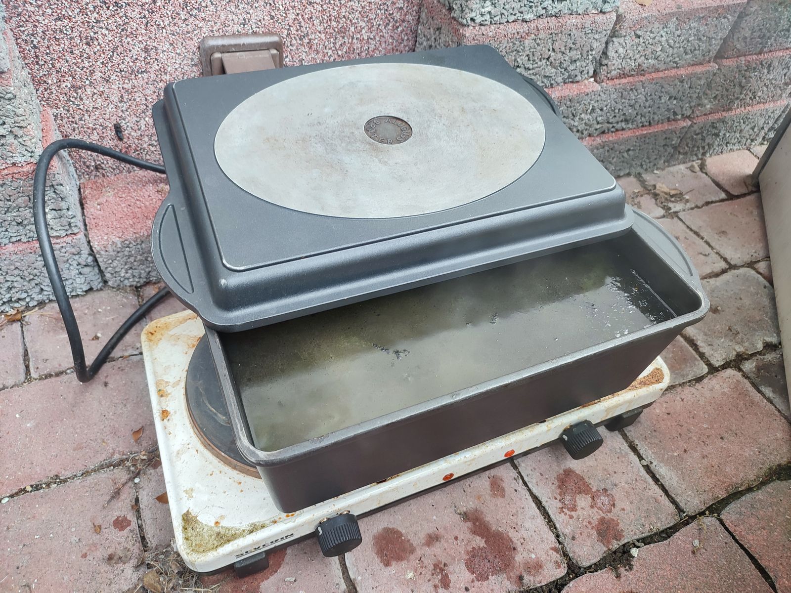 Ich habe mir einen alten Bräter, der für die Küche nicht mehr schick genug organisieren können und eine alte, für den Hausgebrauch nicht mehr geeignete Kochplatte.