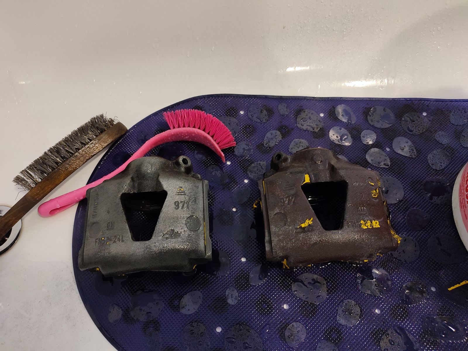 Ich habe die Sättel noch einmal so gut es ging mit einem Drahtbürstenaufsatz für die Bohrmaschine gereinigt und eingeölt: