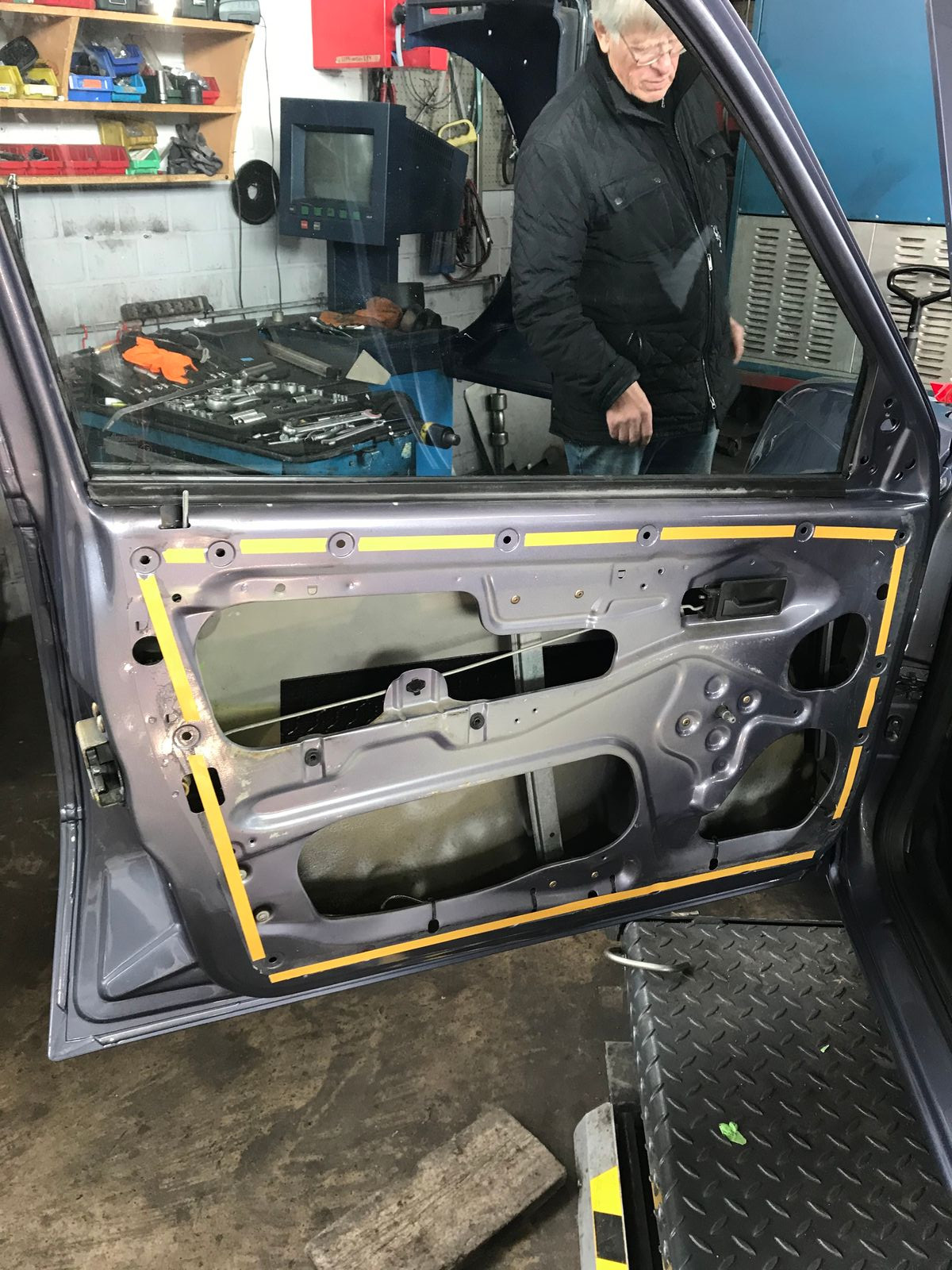 Da sich die Spritzschutzfolie nach 30 Jahren verabschiedet hat und zerbröselt ist, hatte ich im Vorfeld bei Ebay für Ersatz gesorgt. Die Folie ist als Meterware erhältlich und so habe ich alle 4 Türen mit neuen Folien ausstatten können. Die Türinnenseiten wurden vorher auch noch mit Hohlraumwachs ausgespritzt, ebenso die Schweller. Leider habe ich nicht bei jedem Arbeitsschritt Bilder gemacht.. daher hier nur die Tür bei den ersten Vorbereitungen... Die Folie habe ich großzügig vorgeschnitten, dann eingeklebt und dann die Ränder mit einem Cuttermesser eingekürzt...