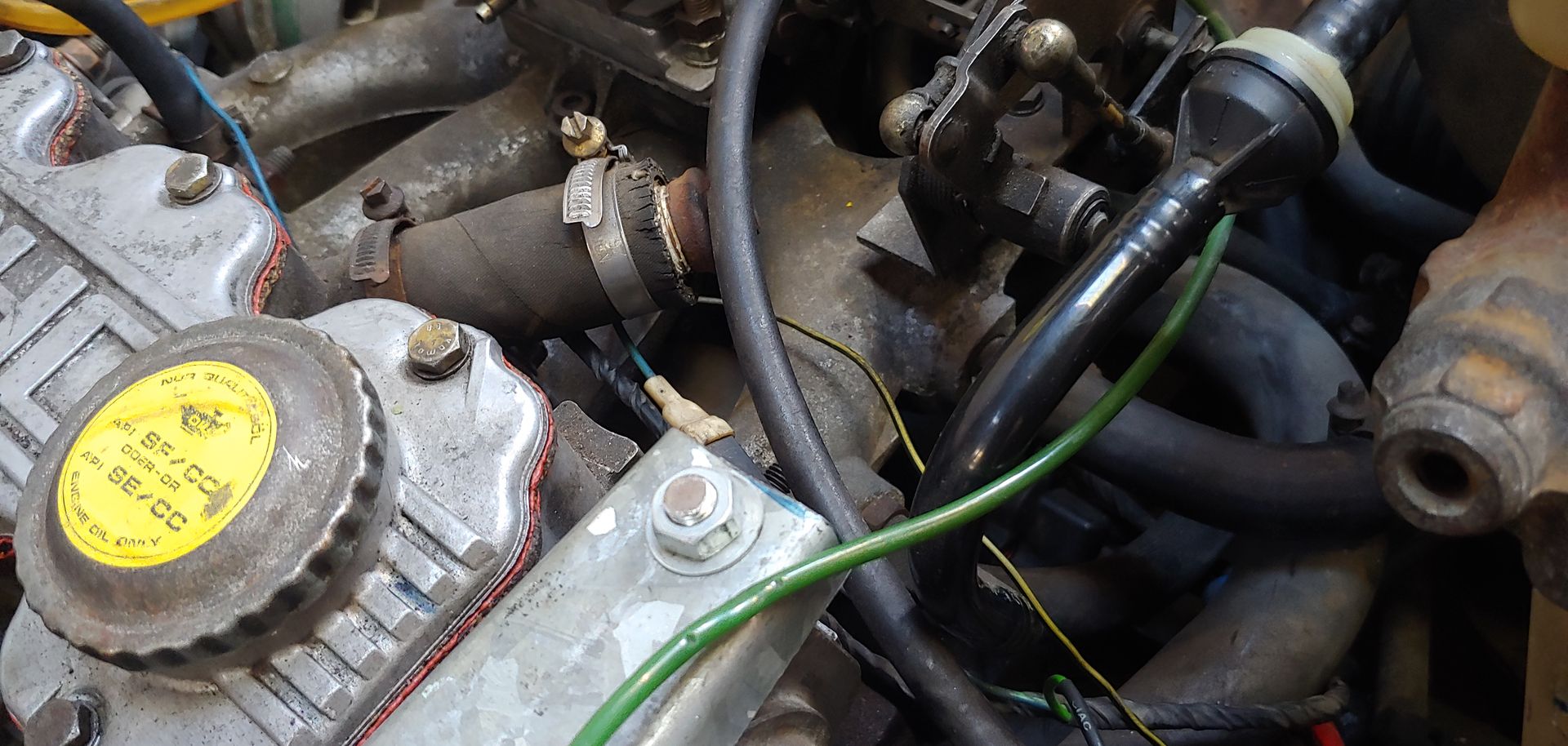 also der Schlauchanschluß sagt mir im ersten Augenblick gar nichts. Habe auch gerade kein passendes Bild von der Rückseite des 13S Motors mit Varajet Vergaser zur Hand. Anbei ein Bild eines 13S Motors mit Pierburg Vergaser. Hier befindet sich an der Stelle ausschließlich der Abgang des Unterdruckschlauches von der Ansaugbrücke zum Bremskraftverstärker.