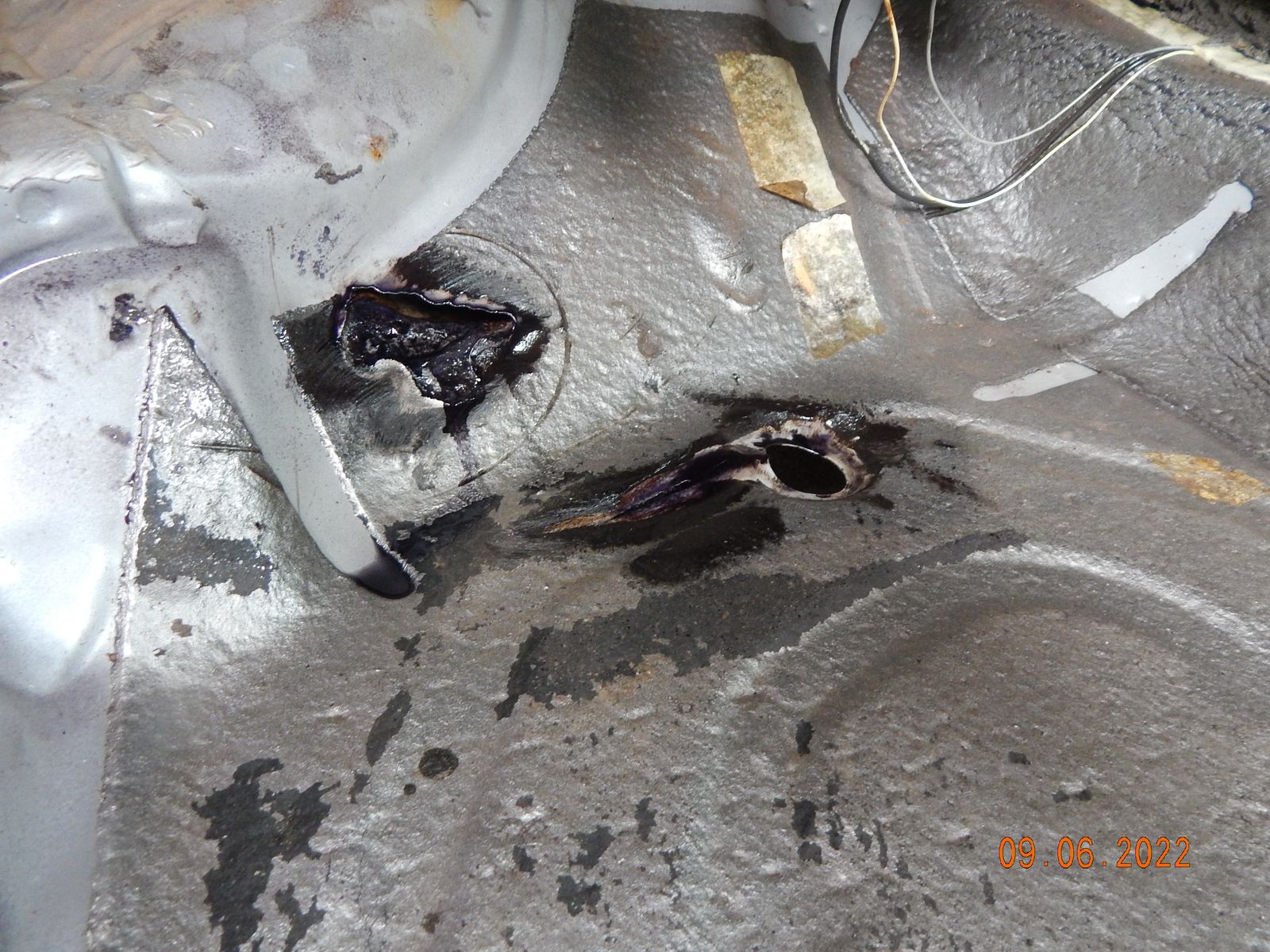 Nachdem die Dämmmatte unter dem Teppich raus war, kamen noch einige Roststellen zum Vorschein (unterhalb der Pedale).