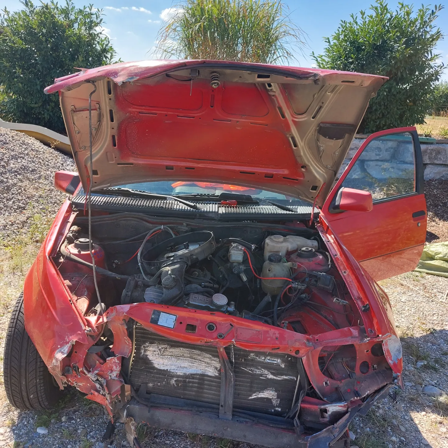 ich hatte unglücklicherweise vor 2 Tagen einen Unfall und bin mit meinem Kadett bei nasser Fahrbahn in die Leitplanke gefahren. Schuld dafür waren die alten Reifen, aber dafür ist es jetzt zu spät. Nach kurzem überlegen habe ich mich dazu beschlossen das Auto selbst mit Freunden zu reparieren, da es mein erstes Auto ist und ich mich nicht von dem Kadett trennen kann. Fotos sind von dem Schaden sind dabei, kurzgefasst: komplette Front kaputt(inklusive Kühler), Rahmen eingedrückt(nicht mehr zum ausbiegen), Kotflügel verbogen, Kupplungsseil kaputt und Kupplungsöl ausgeronnen, Eventuell die vordere Achse hinüber, Motor bekommt Zündfunken und dreht(mehr probiere ich in dem jetzigen Zustand nicht aus), der scheint aber nicht eingedrückt worden zu sein(hängt derzeit schief wegen der Motorhalterung). Meine Vorgehensweise wäre nun folgende: Rahmen so weit es geht ausbiegen, anschließend Motor ausbauen und spalten, Rahmen vorne herausschneiden und neuen reinflexen, Kabelbaum neu verlegen, danach Achse, Getriebe, Kupplung: Bremsen und Rest überprüfen. Was sollte ich anders machen und wo sollte ich mir Hilfe suchen? Ideen für Werkzeuge welche ich vergessen haben könnte?