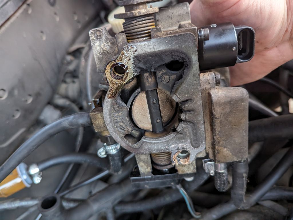 Der Zündfunke war also wieder da, jedoch wurde das Problem mit dem schlechten Kaltstart oder teilweise auch mal gar nicht startendem Motor nicht behoben. Irgendwann ist mir dann aufgefallen, dass das Einspritzventil merkwürdig zerstäubt und teilweise auch krümeliger Dreck auf der Drosselklappe lag.