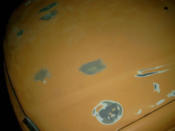 löcher in der motorhaube sind zu. wurden geschweisst, dann mit alu verspachtelt und mit 400er glatt geschliffen, genau wie der rest der karosse mit 400er angeschliffen wird.