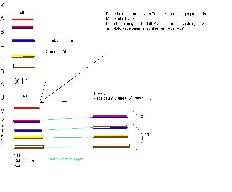 Aber an den drei Steckern (wo in Innenraum gehen) vom Calibra Motorkabelbaum, gibts kein Dauerplus, jetzt haben wir gesehen, dass das Steuergerät (glaub Pin 18 ) von dieser unten markierten Leitung Dauerplus bekommt.